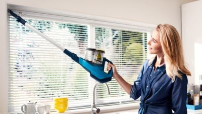 SpeedPro è flessibile e facile da maneggiare. Il contenitore della polvere è situato in alto, per permettere l'uso con angolazioni più strette e di abbassare completamente il dispositivo al livello del pavimento per raggiungere i punti sotto i mobili.