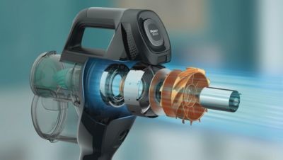 Il motore PowerBlade è progettato per un'elevata velocità dell'aria, per consentire un'aspirazione potente ed efficace in corrispondenza della spazzola.