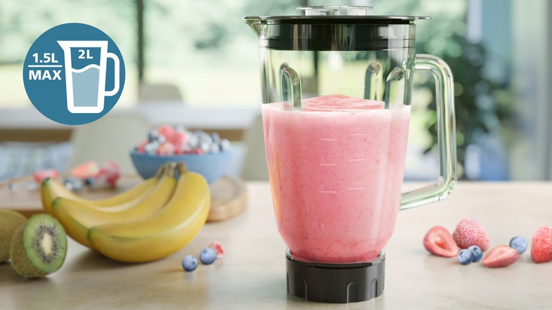 Il grande recipiente da 2 litri con una capacità di lavorazione di 1,5 litri consente di preparare frullati deliziosi e salutari per tutta la famiglia in una volta sola.