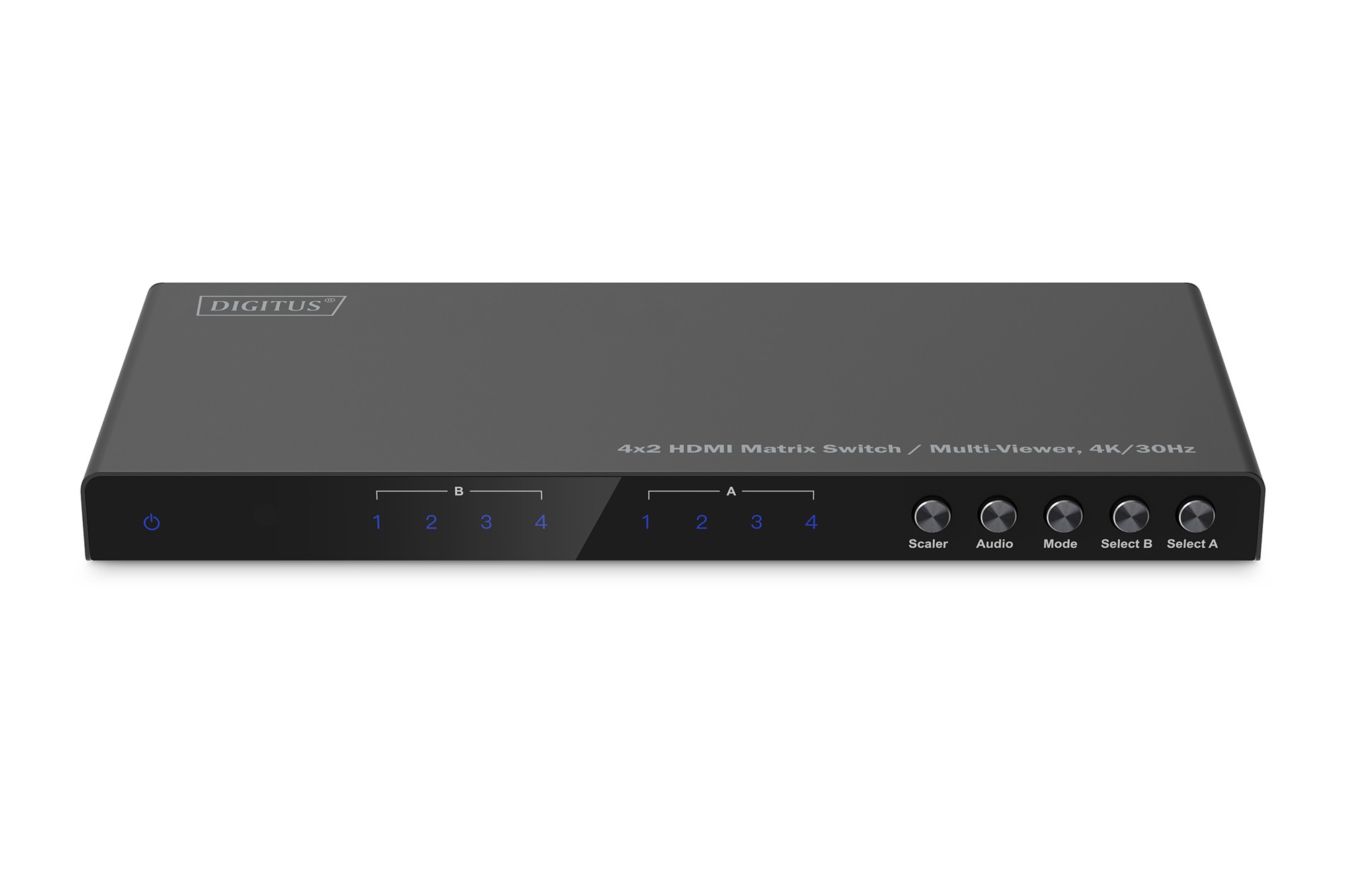 Digitus Switch 4x2 HDMI Matrix / Multi-Viewer, 4K/30Hz, Commutatore a matrice AV, 10,2 Gbit/s, Nero, Metallo, Pulsanti, Remote, status