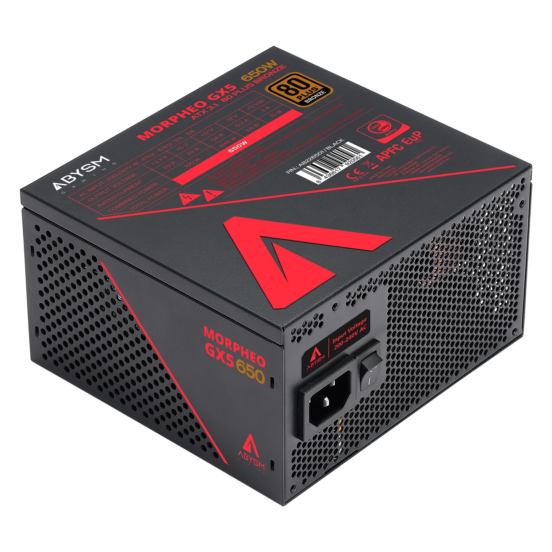 ABYSM MORPHEO GX5. Potenza totale: 650 W, Tensione di ingresso AC: 200 - 240 V, Tipo di correttore del fattore di potenza (PFC): Attivo. Connettore scheda madre: 20+4 pin ATX, Lunghezza del cavo di alimentazione della scheda madre: 65 cm, Lunghezza del cavo di alimentazione SATA: 550,700,850,1000 mm. Utilizzo: PC, Fattore di forma dell'unità di alimentazione (PSU): ATX, Certificazione 80 PLUS: 80 PLUS Bronze. Colore del prodotto: Nero, Tipo di raffreddamento: Attivo, Diametro del ventilatore: 12 cm. Cavi inclusi: CPU, PCIe, Peripheral (Molex), SATA