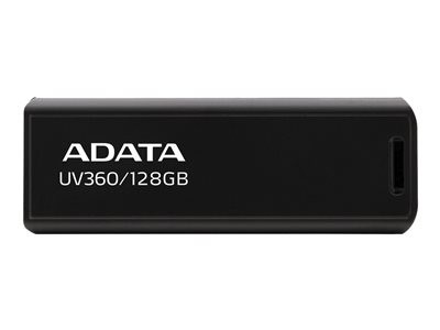 ADATA UV360. Capacità: 128 GB, Interfaccia dispositivo: USB tipo A, Versione USB: 3.2 Gen 1 (3.1 Gen 1), Velocità di lettura: 100 MB/s. Fattore di forma: Lamina di scorrimento. Peso: 13,9 g. Colore del prodotto: Nero