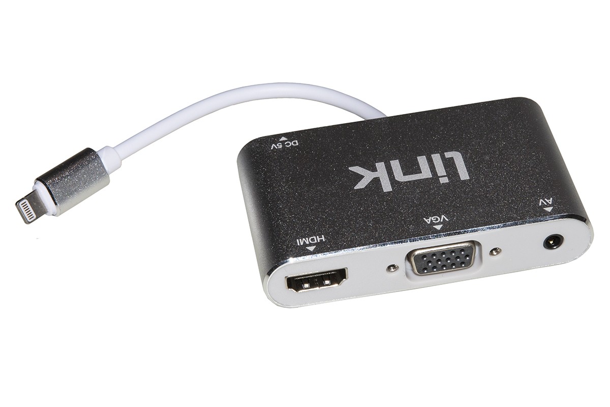 Con questo adattatore si può collegare a un dispositivo come iPhone o iPad una monitor, TV o proiettore HDMI o VGA, e un sistema audio con connettore jack 3,5 mm. La risoluzione arriva a 1080p. Si alimenta tramite la porta micro USB 5 Volt 1 Ampere. Connettori: Input: connettore iPhone 8 poli maschio e alimentazione Micro USB femmina. Output: connettore HDMI femmina, VGA femmina, audio 3.5mm femmina.