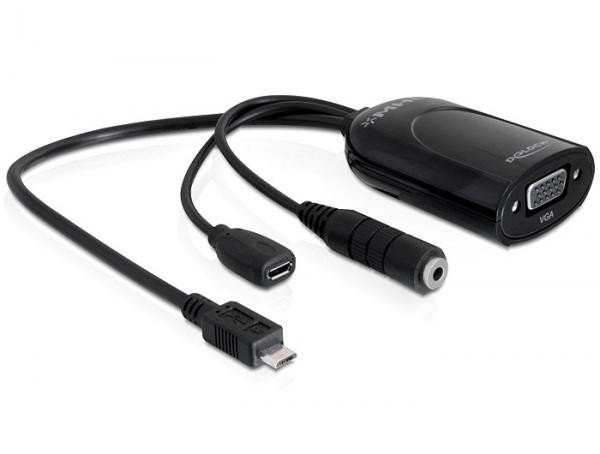 Adattatore per connettere uno smartphone a un nonitor o proiettore, usando un cavo VGA opzionale. Si alimenta tramite la porta micro USB sull'adattatore. Così si possono guardare i video dello smartphone mentre si carica il telefono. Il connettore jack si può utilizzare per trasmettere il segnale audio. Connettori: MHL USB tipo Micro-B 5 pin maschio VGA 15 pin femmina USB tipo Micro-B femmina 3.5 mm stereo jack Si può usare per esempio su Samsung Galaxy S2, HTC Sensation Chipset: Explore + Silicon Image 9292 Supporta una resoluzione fino a 1080p Transferisce segnali audio e video.