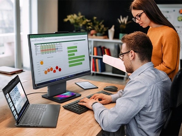 Il PC ThinkCentre Neo 50a di quinta generazione porta innovazione anche nelle attività routinarie. Funzionalità incorporate per l'efficienza, come la modalità Modern Standby e l'opzionale Microsoft Copilot, un assistente di intelligenza artificiale integrato, migliorano la produttività quotidiana. Completamente integrato con Office 365, Copilot può favorire il processo creativo in applicazioni standard, automatizzando attività ripetitive, riepilogando discussioni e altro ancora. La funzionalità di condivisione dello schermo permette di collaborare per un più efficace lavoro di squadra o in occasione di svago: è sufficiente collegare il notebook tramite la porta di ingresso HDMI per goderti i contenuti audio e video sull'ampio schermo dell'AIO.