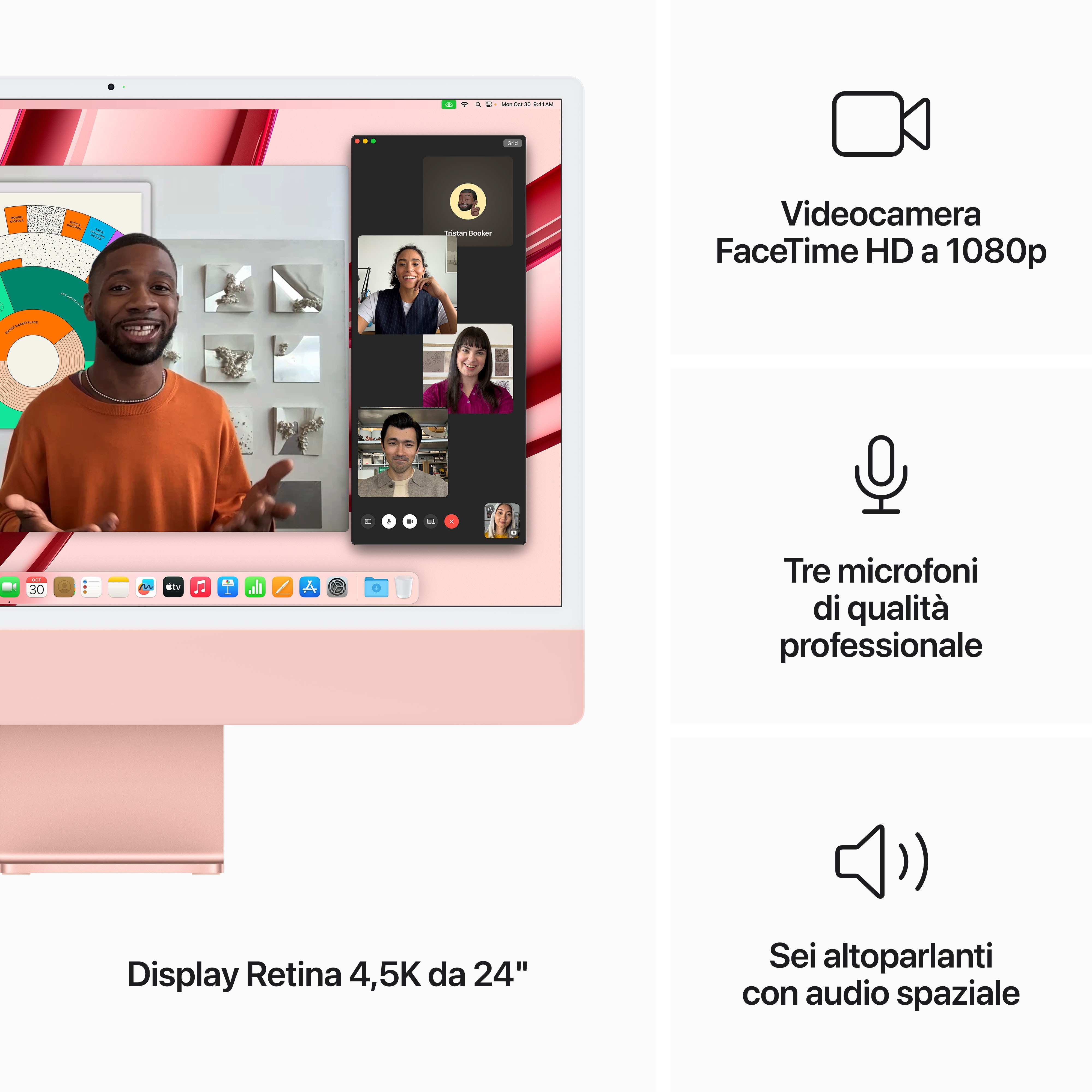 Apple iMac con Retina 24'' Display 4.5K M3 chip con 8‑core CPU e 8‑core GPU, 256GB SSD - Rosa. Tipo di prodotto: PC All-in-one. Dimensioni schermo: 59,7 cm (23.5"), Tipologia HD: 4.5K Ultra HD, Risoluzione del display: 4480 x 2520 Pixel. Famiglia processore: Apple M. RAM installata: 8 GB. Capacità totale di archiviazione: 256 GB, Supporto di memoria: SSD. Modello scheda grafica integrata: Apple GPU. Fotocamera integrata. Sistema operativo incluso: macOS Sonoma. Colore del prodotto: Rosa