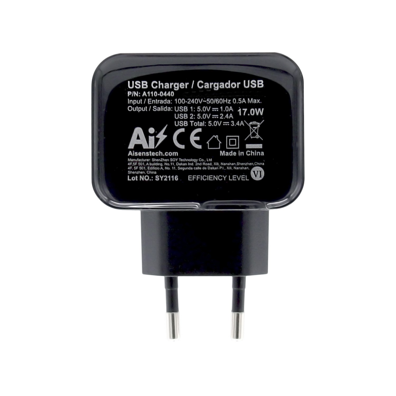 AISENS A110-0440. Tipo di caricatore: Interno, Tipologia alimentazione: AC, Compatibilità caricatore: Universale. Voltaggio di ingresso: 100 - 240 V, Tensione di uscita (max): 5 V, Adattatore di corrente output AC: 3,4 A. Quantità porte USB 2.0: 2. Colore del prodotto: Nero