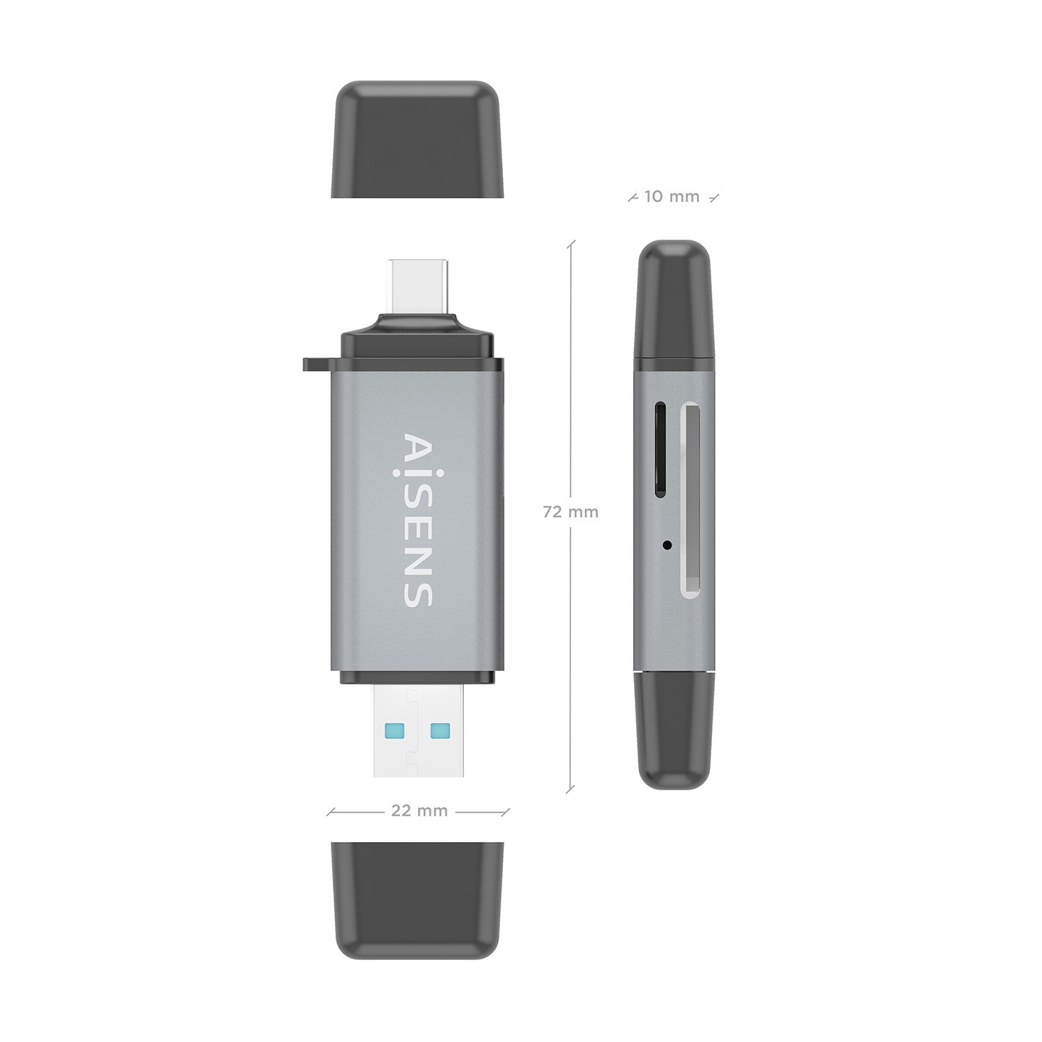 AISENS ASCR-2AC11-GR, MMC, MMCmicro, MicroSD (TransFlash), RS-MMC, Grigio, USB 3.2 Gen 1 (3.1 Gen 1) Type-A/Type-C, 22 mm, 72 mm, 10 mm