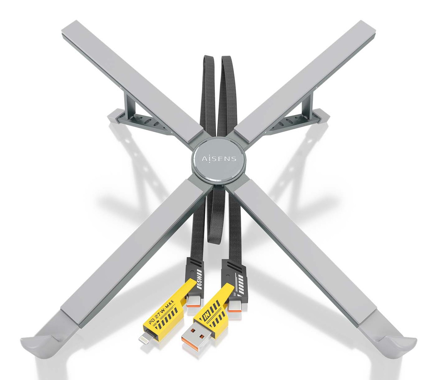 AISENS ASUC-4P021-GR. Tecnologia di connessione: Cablato, Interfaccia host: USB 3.2 Gen 1 (3.1 Gen 1) Type-C, Fornitura di alimentazione USB fino a: 100 W. Colore del prodotto: Grigio. Tipologia alimentazione: USB, Connettore di alimentazione: USB tipo-C. Quantità per pacco: 1 pz, Larghezza imballo: 43 mm, Profondità imballo: 328 mm. Cavi inclusi: USB Type-A to Lightning, USB Type-C to Lightning, Da USB tipo C a USB tipo A, Da USB tipo C a USB..., Dimensione massima compatibile dello schermo del notebook: 38,1 cm (15"), Capacità massima di carico: 3 kg