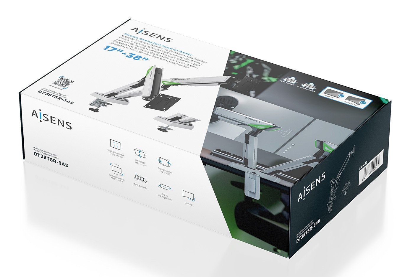 AISENS DT38TSR-345. Montaggio: Morsa/Bullone di ancoraggio, Peso massimo (capacità): 32 kg, Capienza minima dimensioni dello schermo: 43,2 cm (17"), Capienza massima dimensioni dello schermo: 96,5 cm (38"), Compatibilità interfaccia di montaggio (min): 75 x 75 mm, Compatibilità interfaccia di montaggio (max): 100 x 100 mm. Regolazione altezza, Inclinazione: -60 - 60°. Colore del prodotto: Nero, Bianco