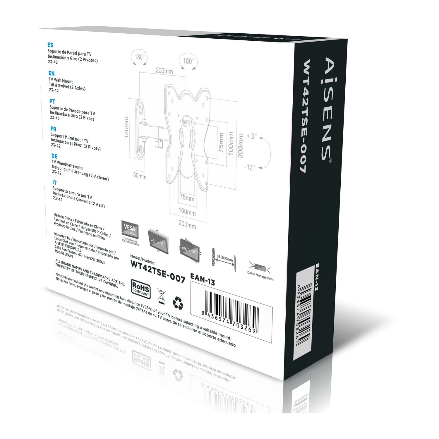 AISENS WT42TSE-007. Peso massimo (capacità): 25 kg, Capienza minima dimensioni dello schermo: 58,4 cm (23"), Capienza massima dimensioni dello schermo: 106,7 cm (42"), Compatibilità interfaccia di montaggio (min): 75 x 75 mm, Compatibilità interfaccia di montaggio (max): 200 x 200 mm. Inclinazione: -12 - 3°, Angolo di rotazione: 180°, Distanza dalla parete (min): 6,5 cm, Distanza dal muro (massima): 20 cm. Colore del prodotto: Nero