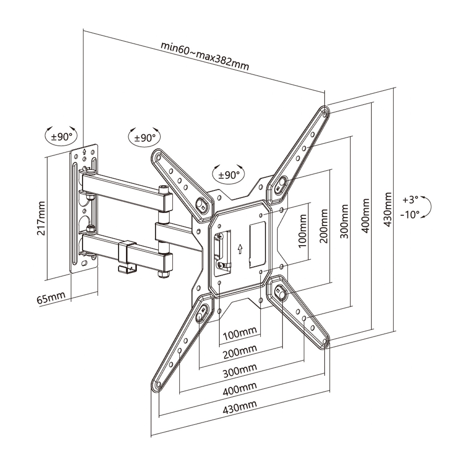 AISENS WT55TSE-153. Peso massimo (capacità): 30 kg, Capienza minima dimensioni dello schermo: 58,4 cm (23"), Capienza massima dimensioni dello schermo: 139,7 cm (55"), Compatibilità interfaccia di montaggio (min): 100 x 100 mm, Compatibilità interfaccia di montaggio (max): 400 x 400 mm. Inclinazione: -10 - 3°, Angolo di rotazione: -90 - 90°, Distanza dalla parete (min): 6 cm, Distanza dal muro (massima): 38,2 cm. Colore del prodotto: Nero
