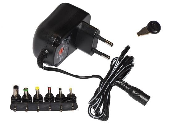 Adattatore per alimentazione regolabile da 3 volt a 12 volt. Con 6 diversi adattatori di alimentazione intercambiabili per alimentare svariati dispositivi. Input: 100-240 Volt Con output selezionabile: DC 3/4,5/5/6/7,5/9/12 Volt Output: 6 Watt 500mA Max Lunghezza cavo 115 cm.
