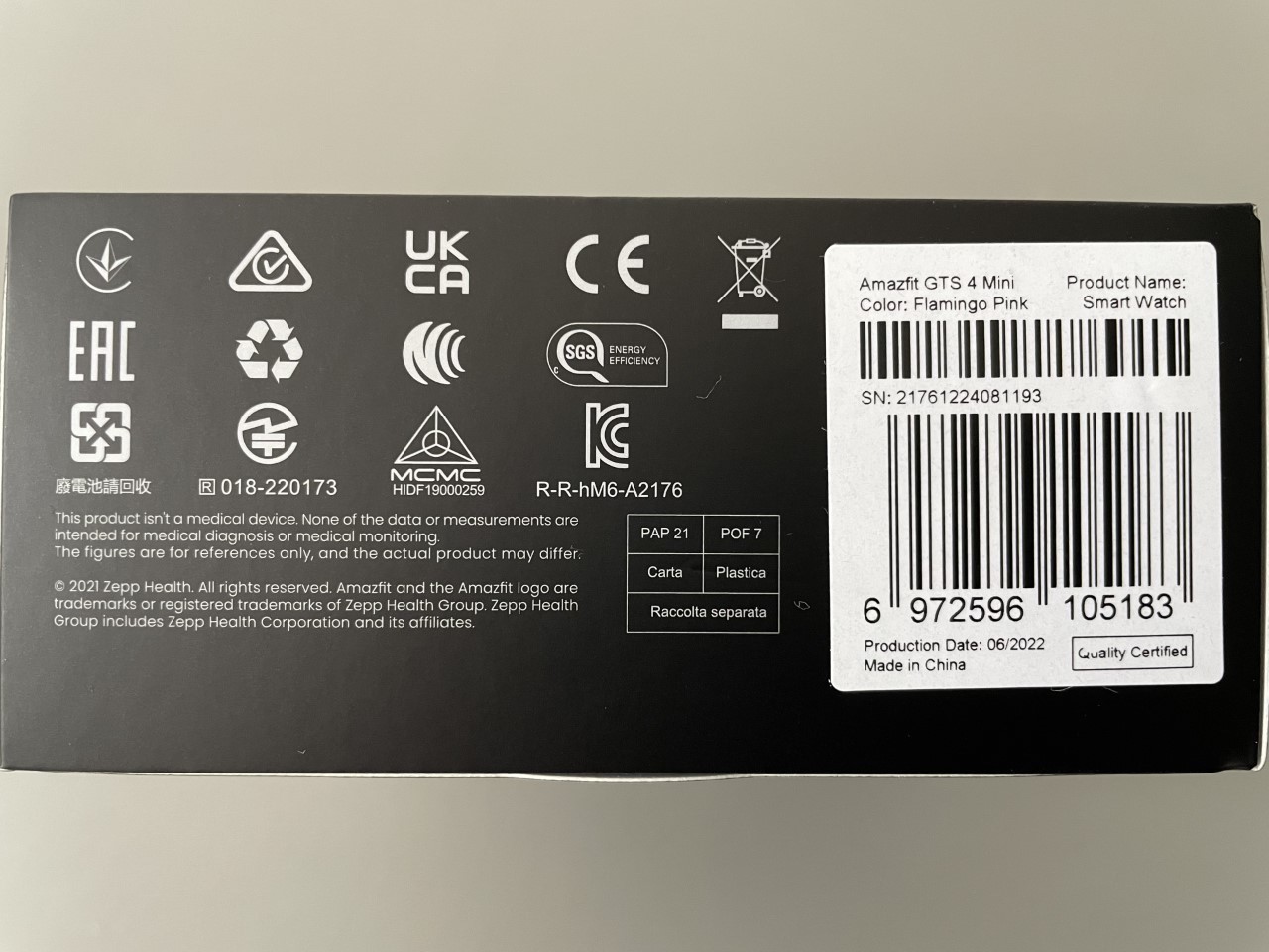 Amazfit GTS 4 mini. Dimensioni schermo: 4,19 cm (1.65"), Tecnologia display: AMOLED, Risoluzione del display: 336 x 384 Pixel, Touch screen. GPS (satellitare). Capacità della batteria: 270 mAh. Peso: 31,2 g. Materiale cinturino: Silicone, Colore cinturino: Rosa