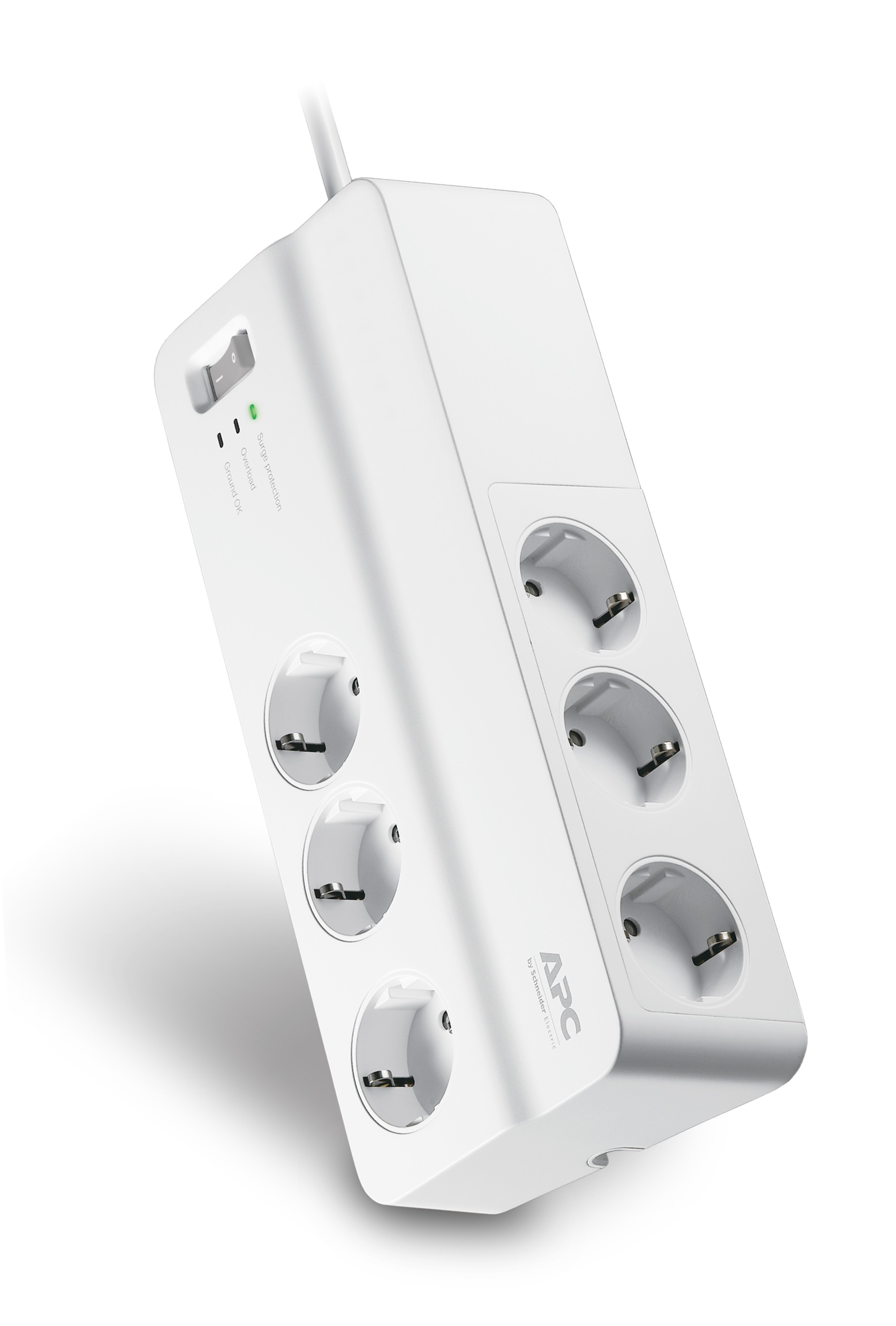APC PM6-GR. Valutazione sovraccarico energetico: 1836 J, Quantità prese AC: 6 presa(e) AC, Tipo di uscita AC: Tipo F. Presa di corrente: Tipo F. Colore del prodotto: Bianco, Filtro rumore EMI/RFI: 40 dB. Lunghezza cavo: 2 m, Peso: 690 g, Larghezza: 271 mm. Larghezza imballo: 310 mm, Profondità imballo: 165 mm, Altezza imballo: 65 mm