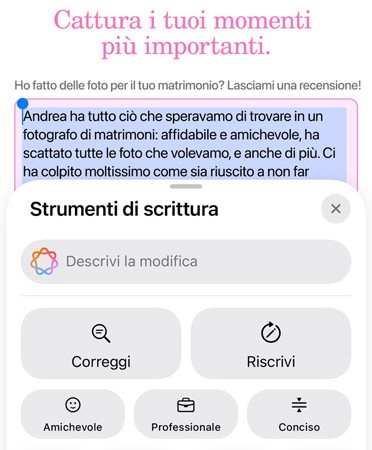 Correggi i tuoi testi, riscrivine diverse versioni fino a trovare il tono e le parole giuste, e riassumi le parti selezionate: ti basta un semplice tap