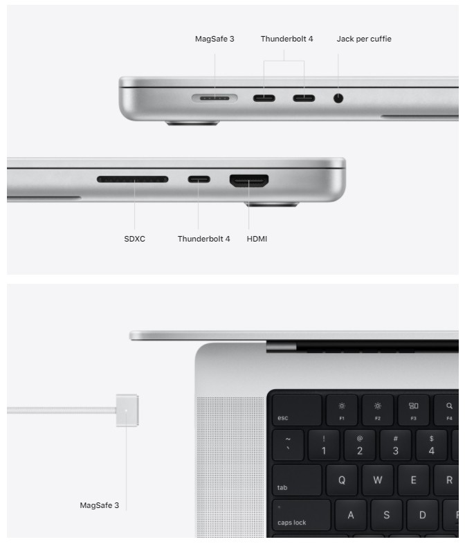 Con il nuovo MacBook Pro hai possibilità infinite. Trasferisci foto e video con il lettore di schede SDXC. Collega monitor e TV all’uscita HDMI. Usa le cuffie grazie al jack da 3,5 mm che rileva i modelli ad alta impedenza e si regola in automatico. Connetti display e periferiche ad alta velocità con le tre porte Thunderbolt 4. E sfrutta la ricarica rapida con la porta MagSafe 3, facile da agganciare e sganciare.