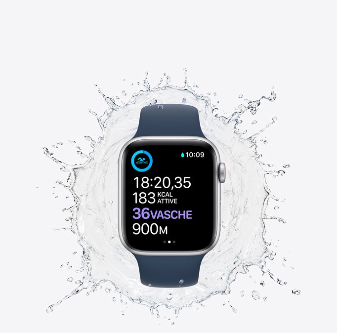 Apple Watch SE è resistente all’acqua fino a 50 metri di profondità. Puoi tuffarti in piscina e avere sott’occhio numero di vasche e tempi parziali. Oppure puoi uscire a nuotare in mare, e vedere sulla mappa il percorso che fai.