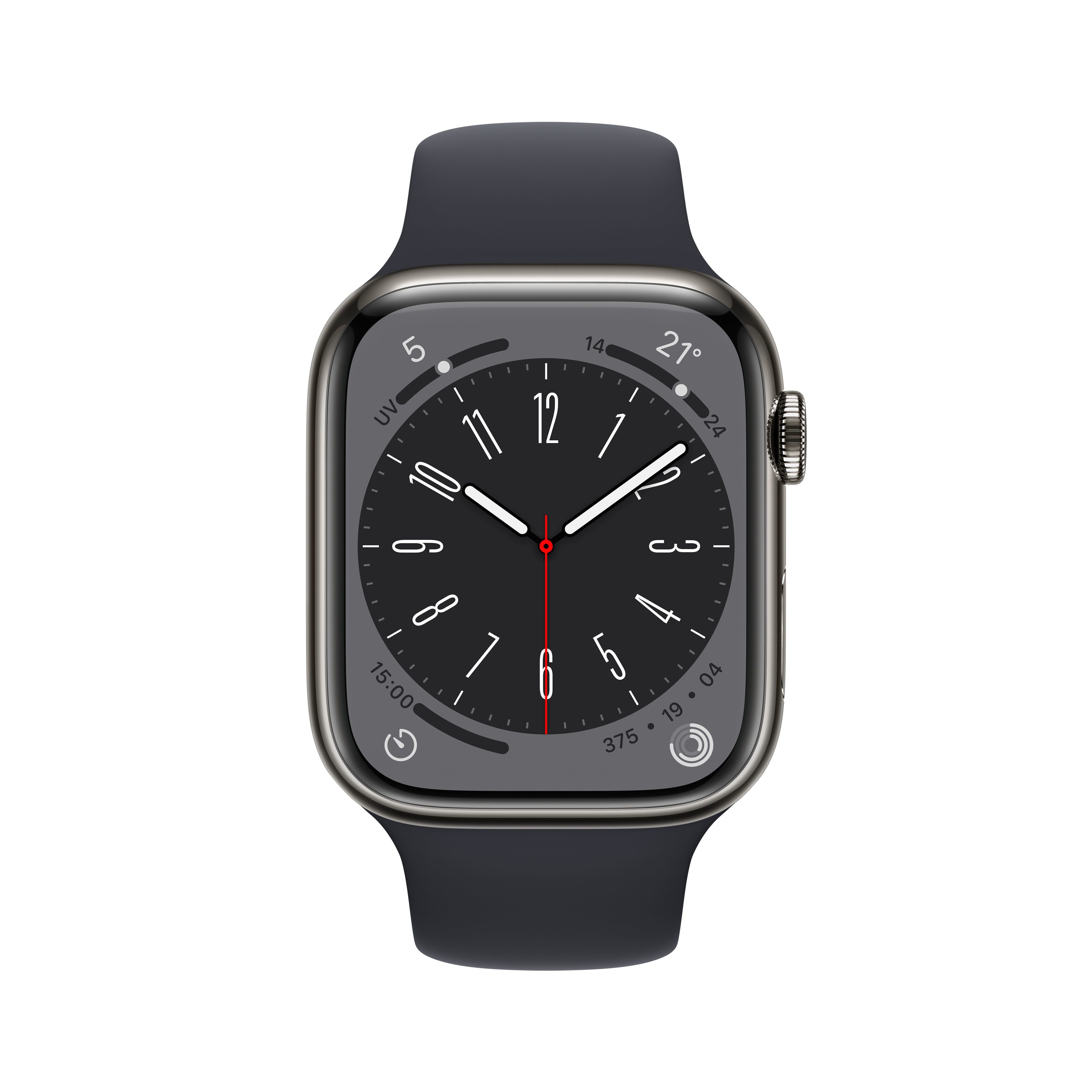 Apple Watch Series 8 GPS + Cellular 45mm Cassa in Acciaio Inossidabile color Grafite con Cinturino Sport Band Mezzanotte - Regular. Tecnologia display: OLED, Risoluzione del display: 396 x 484 Pixel, Touch screen. Memoria flash: 32 GB. Wi-Fi. GPS (satellitare). Peso: 51,5 g. Impermeabile fino a: 50 m, Colore cinturino: Nero. Sistema operativo incluso: watchOS 9