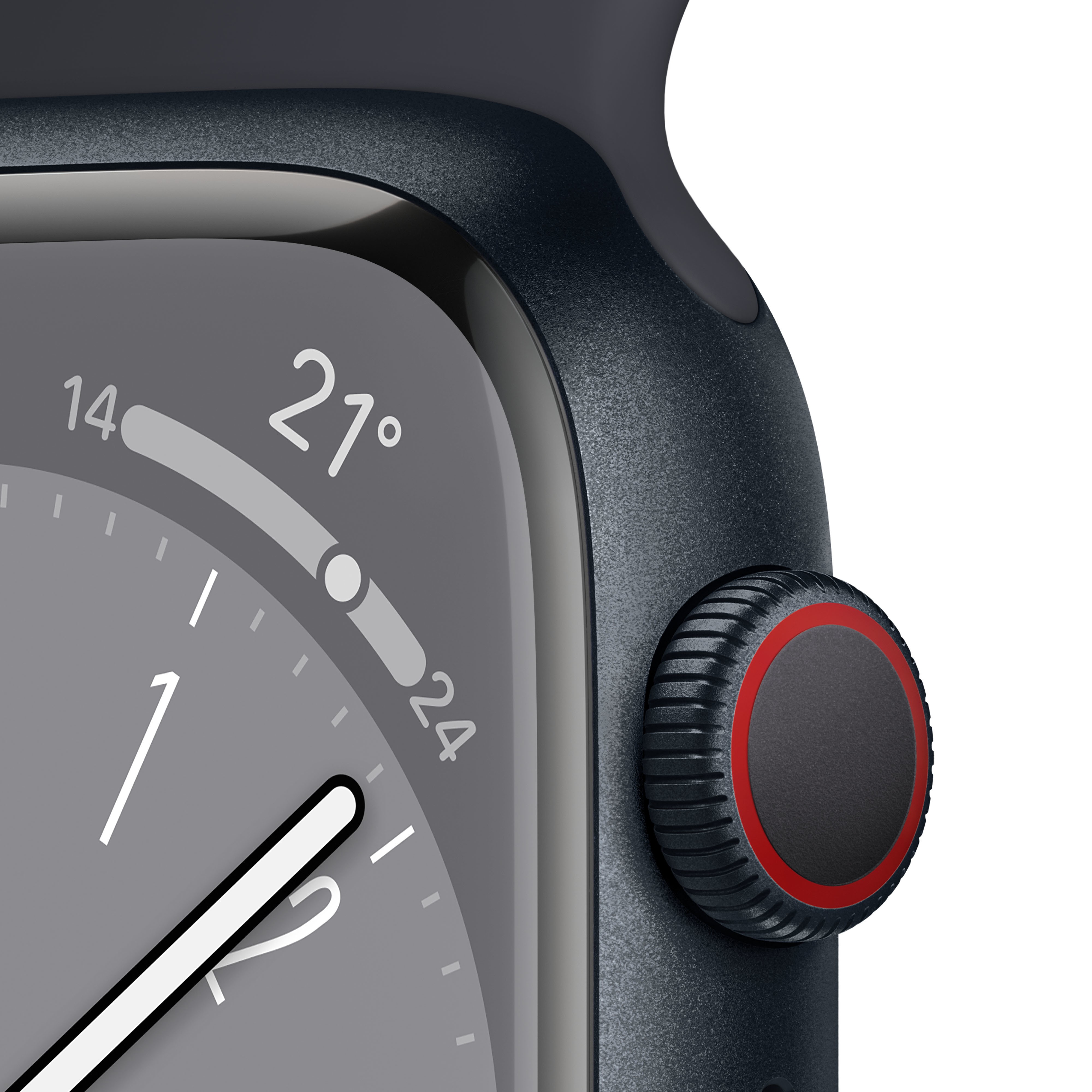 Apple Watch Series 8 GPS + Cellular 45mm Cassa in Alluminio color Mezzanotte con Cinturino Sport Band Mezzanotte - Regular. Tecnologia display: OLED, Risoluzione del display: 396 x 484 Pixel, Touch screen. Memoria flash: 32 GB. Wi-Fi. GPS (satellitare). Peso: 38,8 g. Impermeabile fino a: 50 m, Colore cinturino: Nero. Sistema operativo incluso: watchOS 9