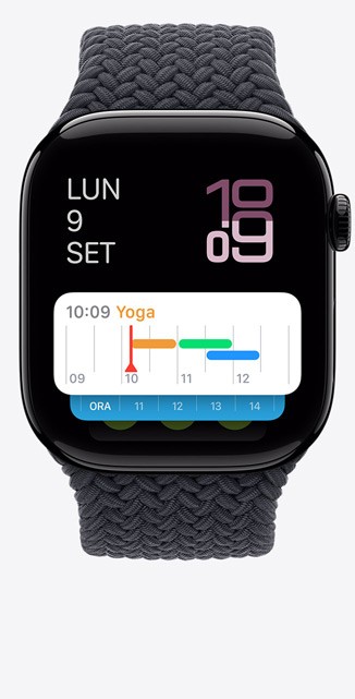 La Raccolta smart ti suggerisce i widget per avere sott’occhio le informazioni più utili in base a dove sei, che ore sono o altro. Per esempio ti avvisa se sta per piovere, se la riunione sta per iniziare o se la tua Uber è in arrivo. E se vai in un Paese in cui si parla una lingua diversa, il tuo Apple Watch se ne accorge e aggiunge in automatico il widget dell’app Traduci alla Raccolta smart.