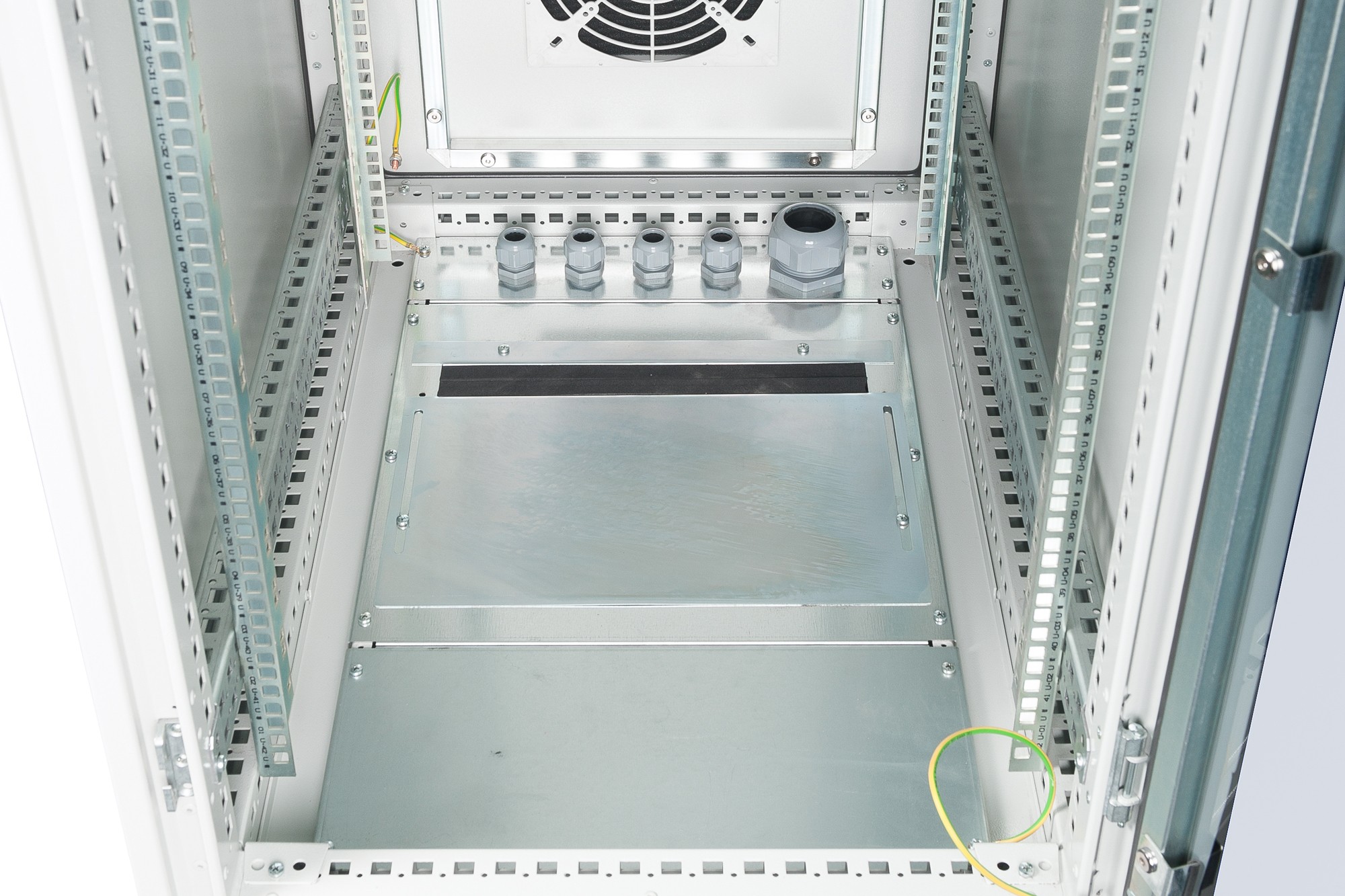 - Safety class IP55 against dust & water ingress acc. to IEC EN60529 - IK10 mechanical impact resistance acc. to IEC EN62262 - 4 point locking system on front- & rear door - incl. already mounted plinth The 483 mm (19") industrial cabinets are protected against dust and water ingress acc. to safety level IP55 (IEC EN 60529) to offer optimized conditions for the user friendly installation of active- and passive network components accompanied by a neat cable management in an industrial area. The color is created by a 70-90 µ strong powder coating in color grey (RAL 7035) with an adhesion capability acc. to EN ISO 2409: Class 0 to 1. An additional implemented 500 hours salt spray resistance test affirms the possible operating temperature range from -25 °C up to +70 °C. The inside mounted 483 mm (19”) profile rails (two pairs = 4 pieces) are galvanized and with height unit marking (countable from both directions). They are variable in depth and connected with additional depth support bars to realize extensive 483 mm (19”) equipment installations. Furthermore there is an rotary profile hole structure inside. Each cabinet is equipped with a plinth (100 mm height) which offers additional space for cabling. The base of each cabinet is equipped with a sliding cable entry panel with rubber sealing as well as five PG cable screw inlets (4x PG21 + 1x PG48). An extensive portfolio of accessories for cable management, shelves, etc. will help to meet many requirements in daily use.