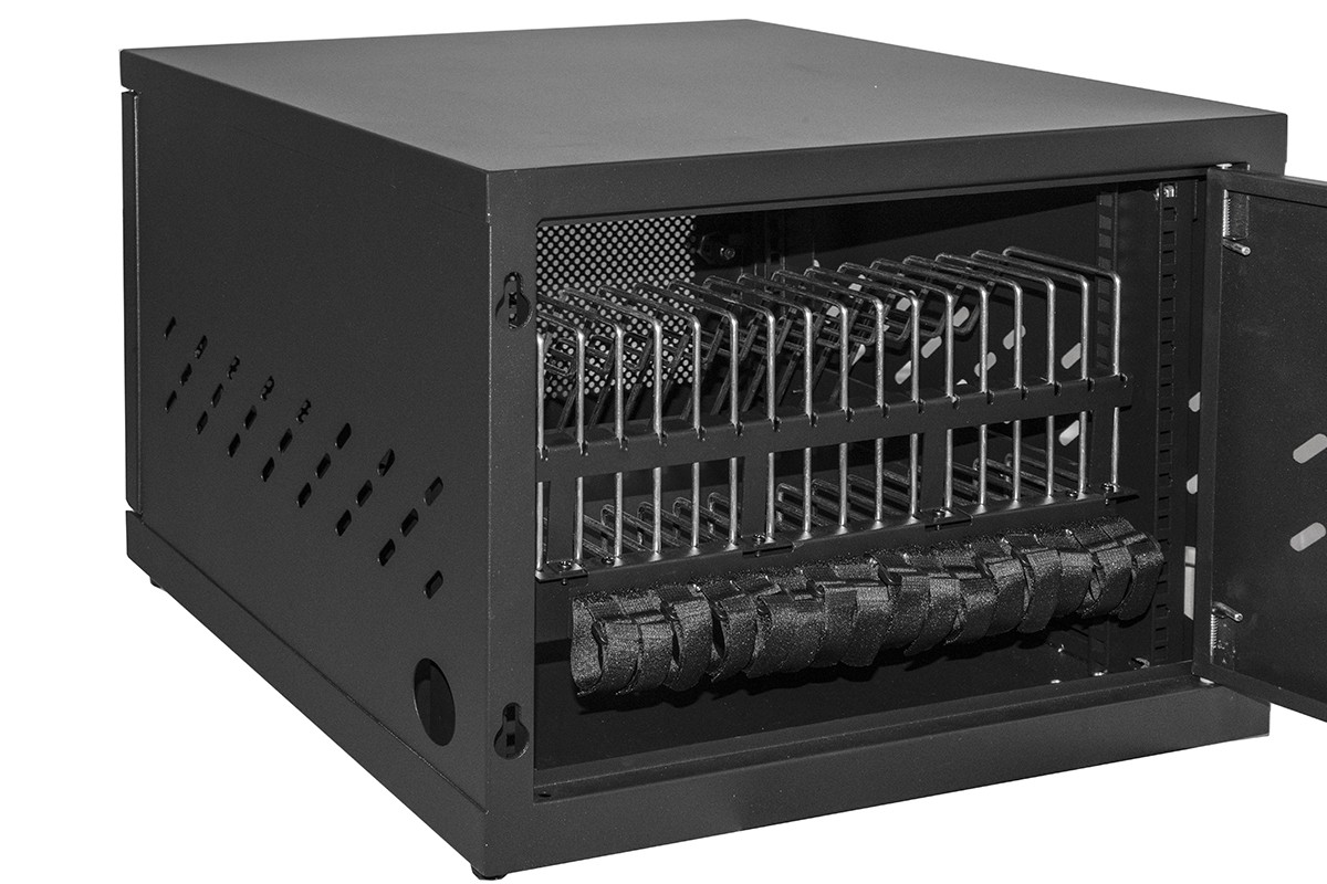Armadio con chiusura a chiave che permette la protezione dei notebook e tablet custoditi all'interno.I dispositivi si posizionano in verticale sul ripiano estraibile, separati da dei divisori.I cavi di alimentazione si possono fissare con le fascette incuse.Ideale per scuole o uffici.L'interno si puт personalizzare a seconda delle esigenze, sul fondo dell'armadio si puт posizionare una multipresa o un alimentatore multiporta USB per i tablet.Nella parte posteriore inoltre ci sono due montanti standard 19'' su cui montare eventualmente delle multiprese.L'armadio и in acciaio, assicura la protezione dei dispositivi interni, e ne permette l'areazione grazie alle fessure laterali e alla porta grigliata.Capacitа: 16 tablet o 16 laptop fino a 15.6'' in verticale.Ci si possono alloggiare dispositivi di misura massima cm 25 x 36, altezza cm 2,3.Con piedini, si puт anche installare a muro.Ruote incluse.La porta anteriore e posteriore hanno la chiusura a chiave, e sono reversibili.Entrata dei cavi di alimentazione dai due lati.Multiprese non incluse.Misure: cm 55,5 (L) x 55 (P) x 41 (A)