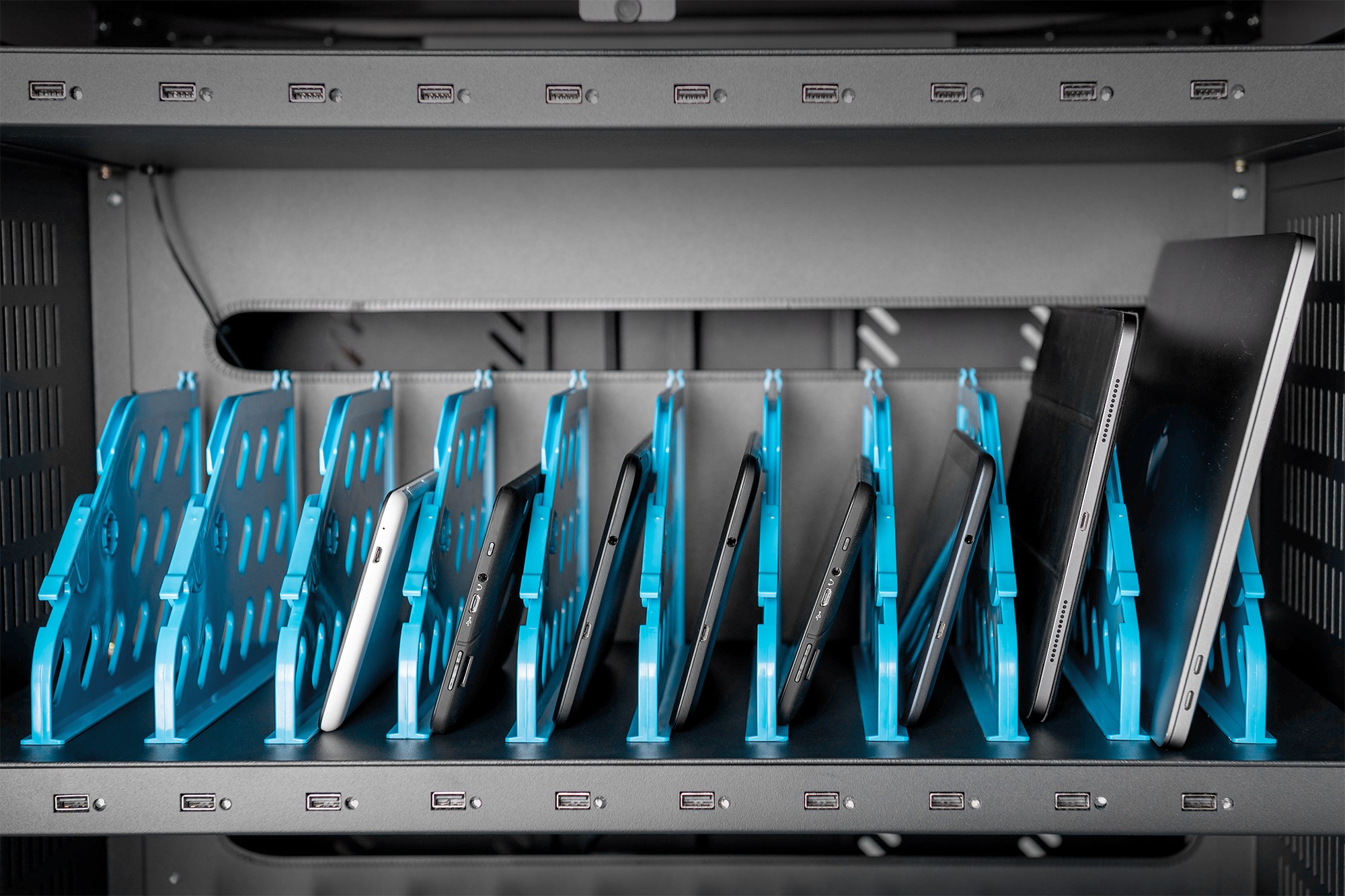 La soluzione ideale per riporre e ricaricare i propri dispositivi mobili. - 30 postazioni (3x10) per dispositivi - 30 attacchi USB - 3 prese multiple installate sul retro (10 prese munite di messa a terra, incl. interruttore) - Passaggio per cavi e vano per cavi molto lunghi per piano - Alloggiamento compatto, mobile grazie alle ruote montate - 3 ventole (24 V) per raffreddare attivamente l’armadio - Incl. salvavita 30 mA L’armadio di ricarica mobile di DIGITUS® è la soluzione ideale e compatta per riporre e ricaricare i propri dispositivi mobili, come notebook e tablet. Spesso gli armadi di ricarica mobili vengono utilizzati in istituzioni pubbliche, come scuole, per conservare i dispositivi in un unico posto centrale e sicuro e poterli ricaricare al contempo. Nell’armadio vi sono 3 rack con 10 postazioni di ricarica ciascuno e dotati di un proprio collegamento USB sul lato frontale. Inoltre, i dispositivi possono essere collegati sul retro alla prese multiple integrate (3 x 10 contatti di sicurezza). La gestione cavi ottimale è garantita dagli ampi passaggi cavi e dai vani per quelli molto lunghi. Le ventole integrate (3 x 24 V) unitamente alle fessure di areazione si occupano di raffreddare attivamente l’armadio.