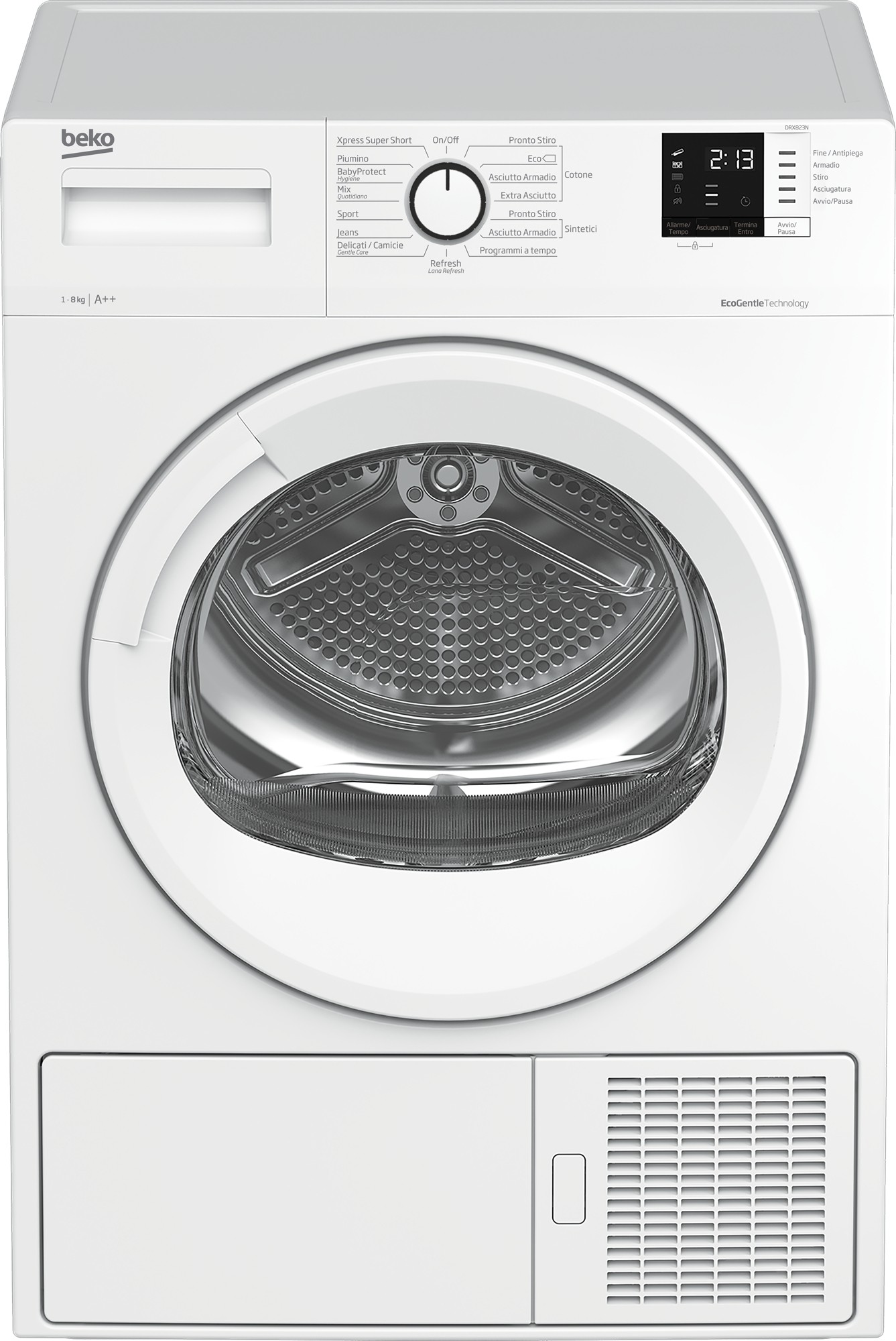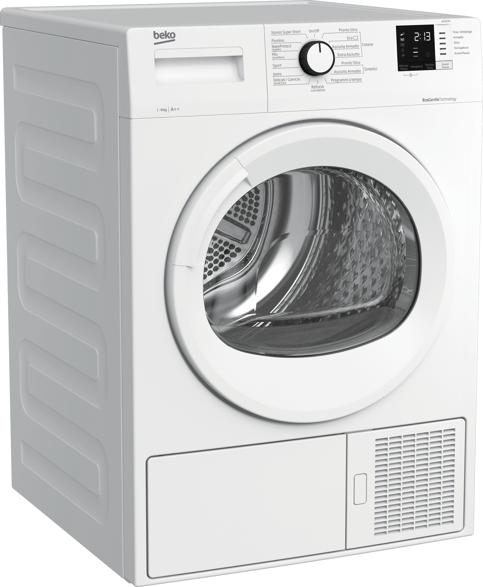 Beko DRX823N. Posizionamento dell'apparecchio: Libera installazione, Tipo di carica: Caricamento frontale, Sistema di asciugatura: Pompa di calore. Capacità cestello: 8 kg, Classe efficacia di asciugatura: B, Programmi di asciugatura: Mix, Programmato, Rapido, Risciacquo, Delicati/Seta, Camicia/maglietta. Partenza ritardata: 24 h. Classe efficienza energetica: A++, Consumo energetico annuo: 235 kWh, Fonte di calore: Elettrico. Profondità: 540 mm, Larghezza: 600 mm, Altezza: 850 mm