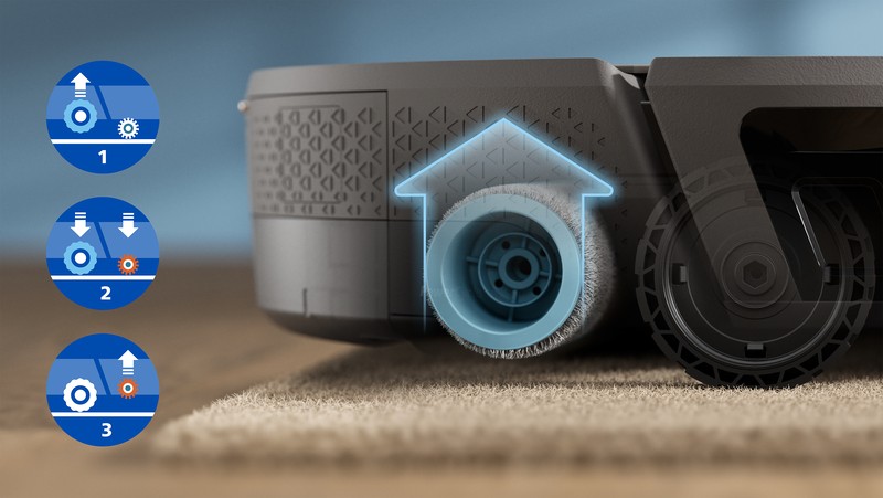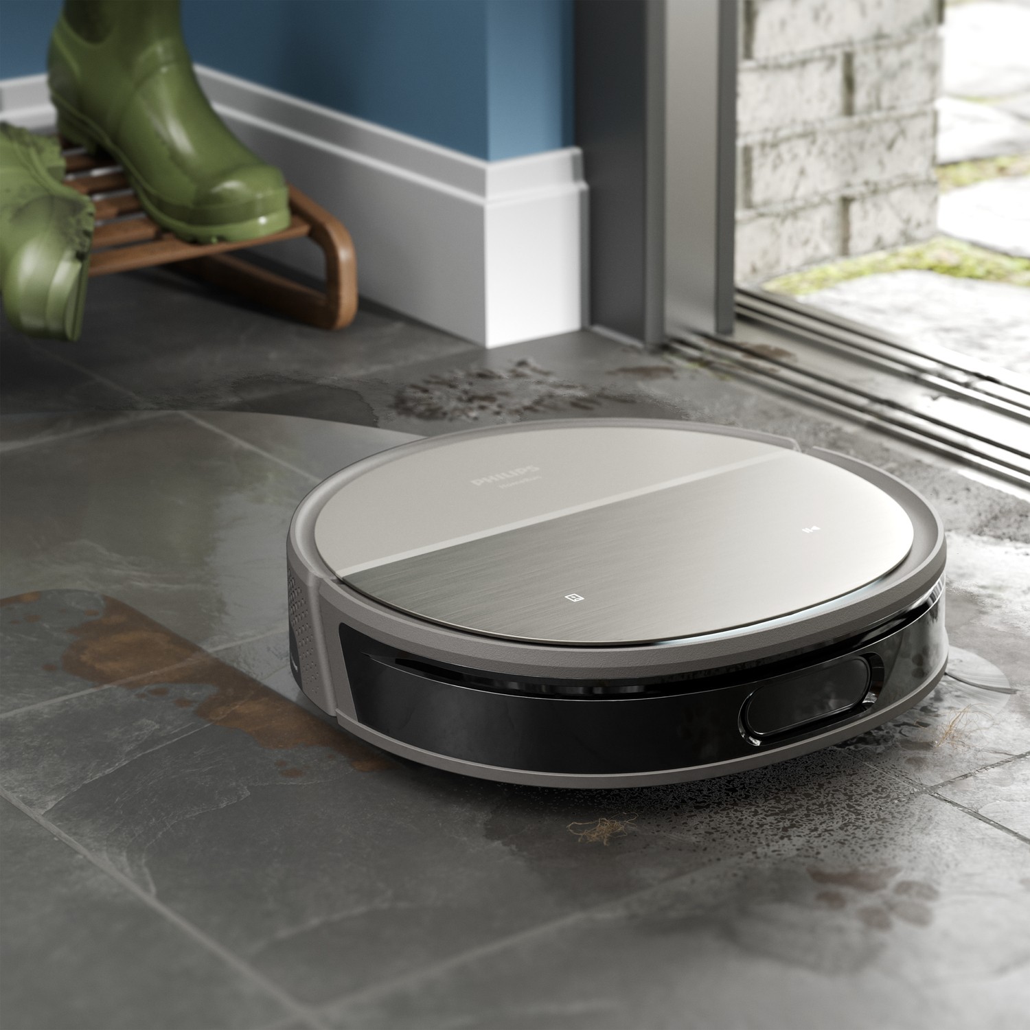 Philips HomeRun Serie 9000 si adatta perfettamente ai diversi tipi di pavimento. Grazie al sistema di sollevamento a doppio rullo, il panno si solleva automaticamente per evitare di bagnare i tappeti.