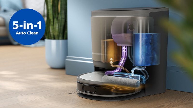 Goditi fino a 3 settimane di pulizia senza manutenzione con la stazione All-in-One: svuota automaticamente il contenitore della polvere fino a 70 giorni¹. Ricarica in modo indipendente il serbatoio dell'acqua pulita e svuota quello dell'acqua sporca fino a 3 settimane¹. Lava e asciuga a caldo (50°C) il panno senza alcuno sforzo, per iniziare ogni volta con il panno pulito.