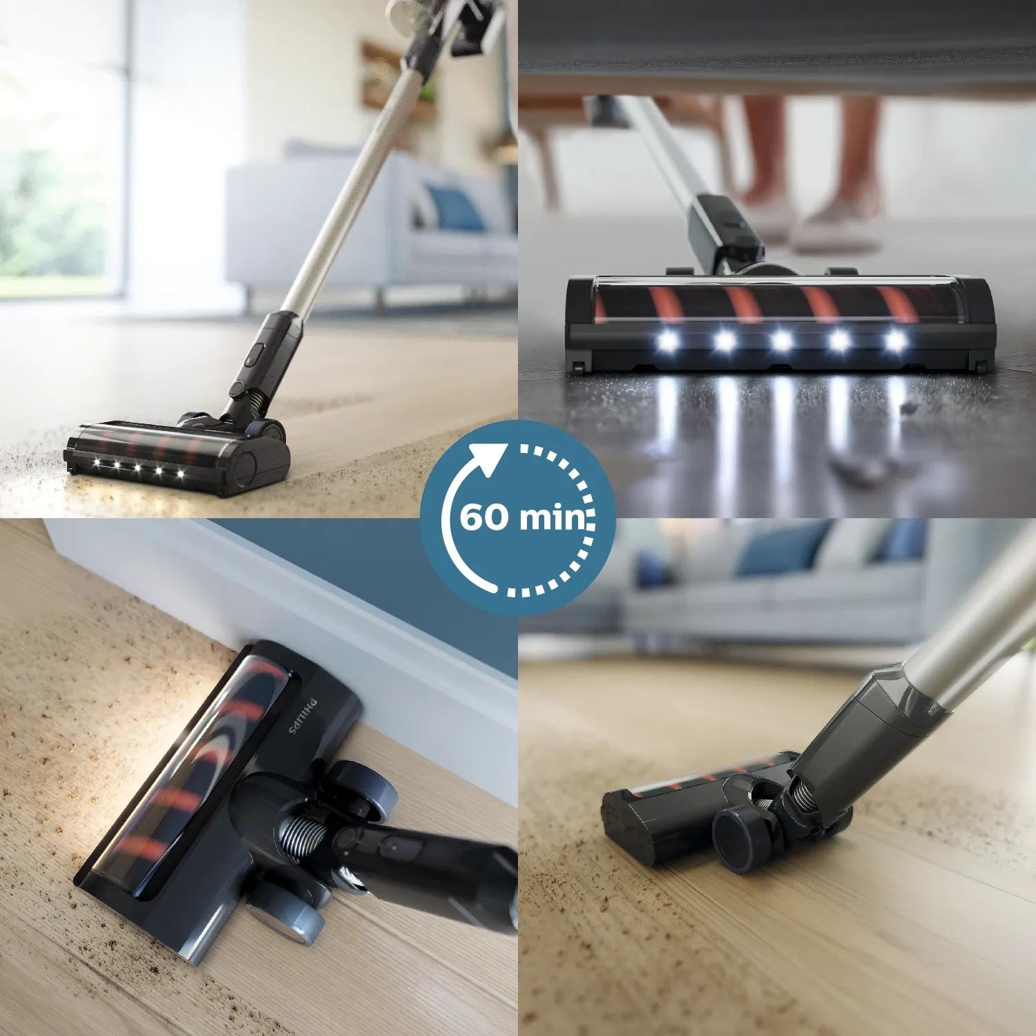 Dai valore a ogni movimento con la spazzola LED, catturando fino al 99% di polvere e sporco nell'impostazione più alta(4). Illumina le minuscole particelle di polvere emettendo luce in modo preciso alla giusta angolazione, per sapere esattamente dove pulire. La spazzola è progettata per scorrere rasente alle pareti e ai bordi, catturando le particelle di sporco più ostinate. Rimuovi fino all'ultimo granello di polvere.