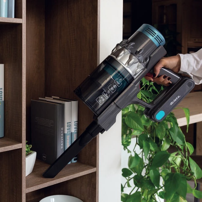 Ariete 2704 22V Lithium Digital Panel, Scopa elettrica senza filo, Cordless, Voltaggio 22,2V, Capacità serbatoio 1L, Spazzola motorizzata, Blu. Tipo di prodotto: Aspirapolvere a bastone 2 in 1, Tipo di contenitore della polvere: Senza sacchetto, Colore del prodotto: Azzurro. Tipo di pulizia: Secco, Sistema di filtraggio dell'aspirapolvere: HEPA, Metodo di separazione dello sporco: Ciclonico. Controllo dell'energia: Meccanico. Alimentazione: Batteria, Massima potenza in entrata: 150 W, Potenza motore: 150 W. Larghezza imballo: 245 mm, Profondità imballo: 730 mm, Altezza imballo: 140 mm