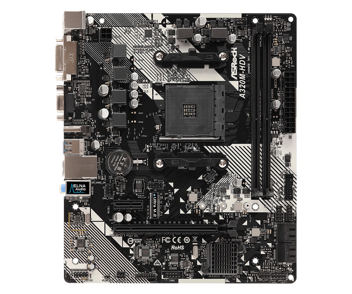 Asrock A320M-HDV R4.0. Produttore processore: AMD, Presa per processore: Presa AM4, Processori compatibili: AMD A, AMD Athlon, AMD Athlon X4, AMD Ryzen 3, 2nd Generation AMD Ryzen™ 3, AMD Ryzen 3 3rd Gen,.... Tipi di memoria supportati: DDR4-SDRAM, RAM massima supportata: 32 GB, tipo di slot di memoria: DIMM. Interfacce dell'unità di archiviazione supportate: SATA III,Ultra M.2, Tipi di unità di archiviazione supportate: HDD & SSD. Famiglia della scheda grafica: AMD, Risoluzione massima: 4096 x 2160 Pixel. Tipo di interfaccia Ethernet: Gigabit Ethernet, Controller LAN: Realtek 8111H