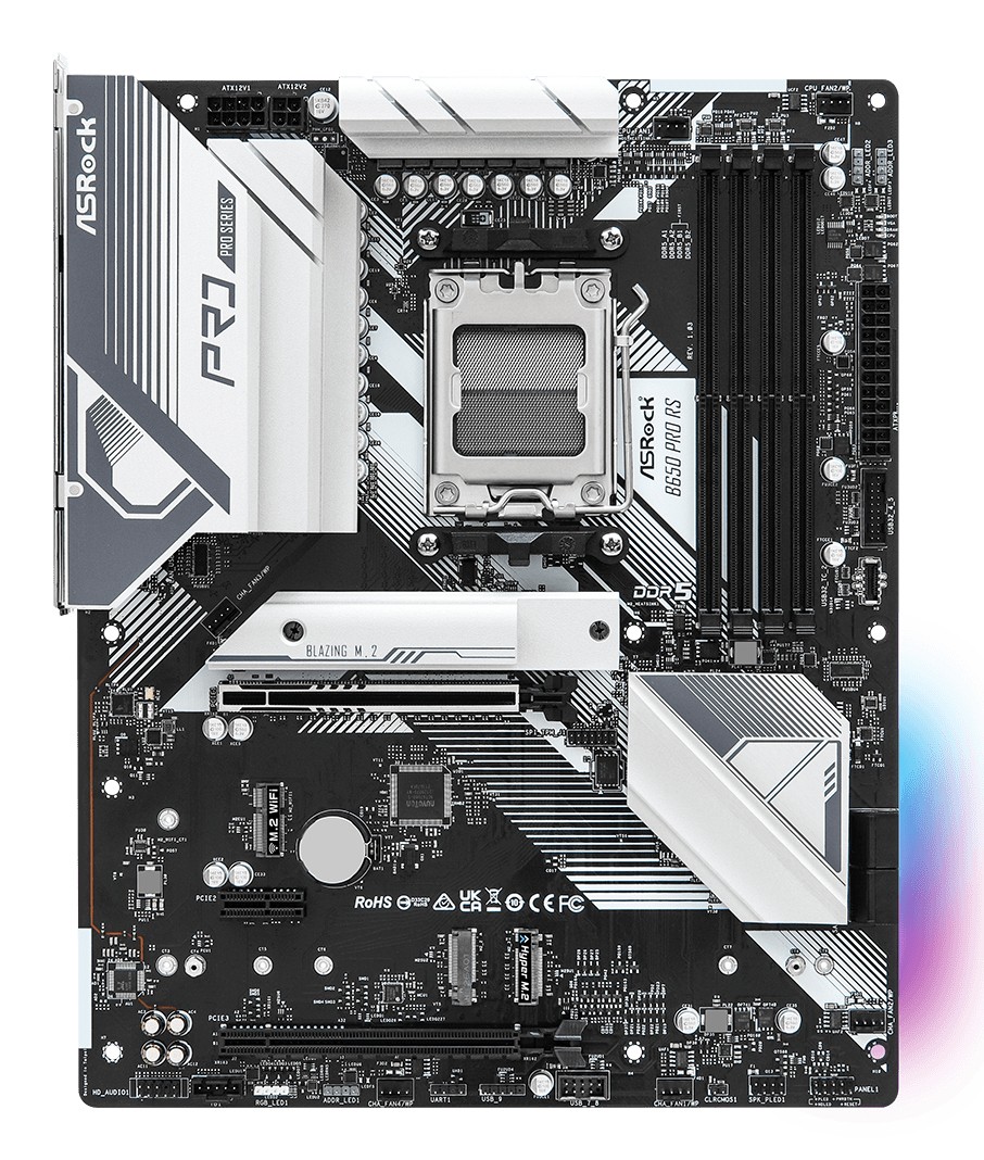 Asrock B650 Pro RS. Produttore processore: AMD, Presa per processore: Socket AM5, Processori compatibili: AMD Ryzen 7000 Series. Tipi di memoria supportati: DDR5-SDRAM, RAM massima supportata: 128 GB, tipo di slot di memoria: DIMM. Interfacce dell'unità di archiviazione supportate: M.2, SATA III, Tipi di unità di archiviazione supportate: HDD & SSD, Livelli RAID: 0, 1, 10. Tipo di interfaccia Ethernet: 2.5 Gigabit Ethernet, Controller LAN: Dragon RTL8125BG. Componente per: PC, Fattore di forma scheda madre: ATX, Famiglia di chipset per scheda madre: AMD