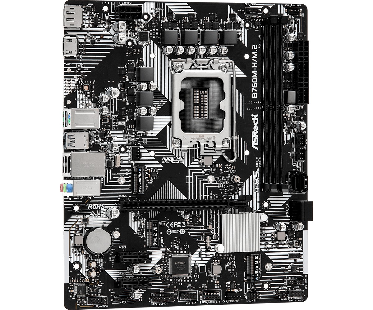 Asrock B760M-H/M.2. Produttore processore: Intel, Presa per processore: LGA 1700, Processori compatibili: Intel® Core™ i3, Intel® Core™ i5, Intel® Core™ i7, Intel® Core™ i9. Tipi di memoria supportati: DDR5-SDRAM, RAM massima supportata: 96 GB, tipo di slot di memoria: DIMM. Interfacce dell'unità di archiviazione supportate: M.2, SATA III, Tipi di unità di archiviazione supportate: HDD & SSD, Livelli RAID: 0, 1, 5, 10. Tipo di interfaccia Ethernet: Gigabit Ethernet, Controller LAN: Realtek RTL8111H. Componente per: PC, Fattore di forma scheda madre: micro ATX, Famiglia di chipset per scheda madre: Intel