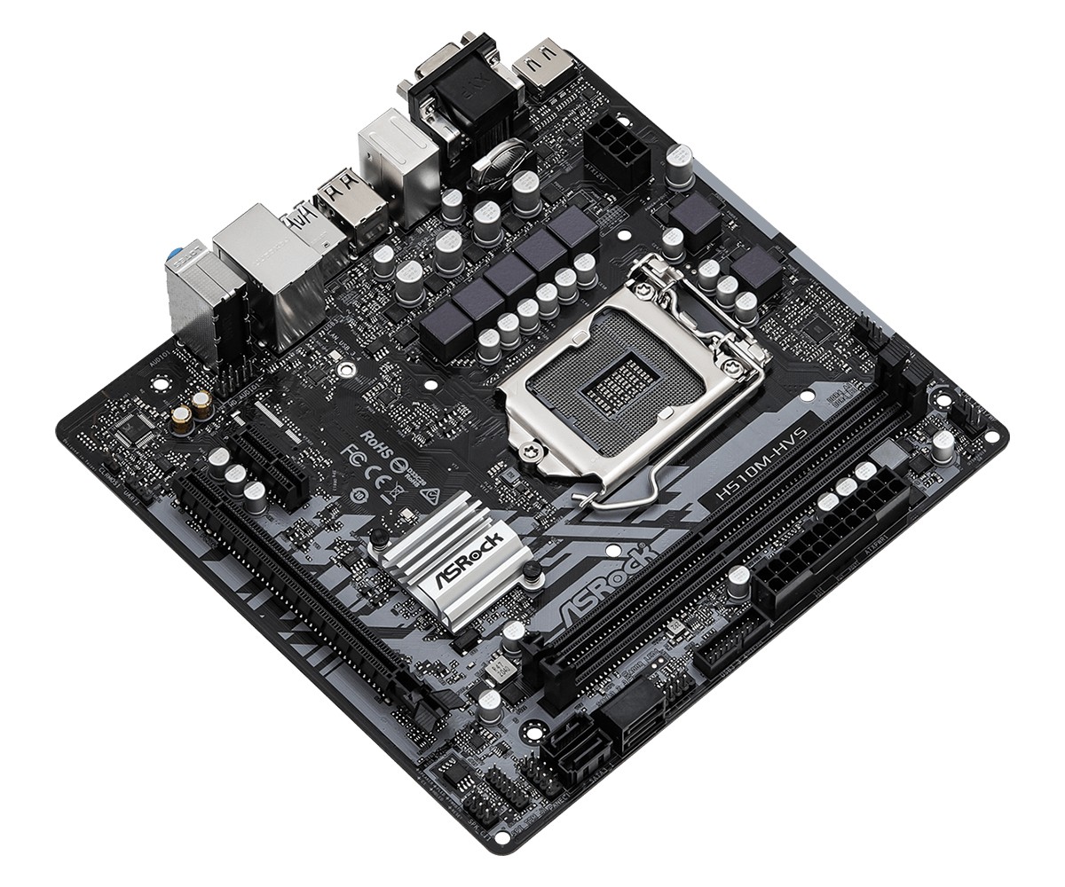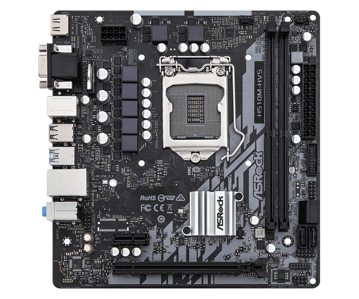 Asrock H510M-HVS R2.0. Produttore processore: Intel, Presa per processore: LGA 1200, Processori compatibili: Intel® Celeron®, Intel® Core™ i3, Intel® Core™ i5, Intel® Core™ i7, Intel® Core™ i9, Intel® Pentium®. Tipi di memoria supportati: DDR4-SDRAM, RAM massima supportata: 64 GB, tipo di slot di memoria: DIMM. Interfacce dell'unità di archiviazione supportate: SATA III. Risoluzione massima: 4096 x 2160 Pixel. Tipo di interfaccia Ethernet: Gigabit Ethernet, Controller LAN: Realtek RTL8111H