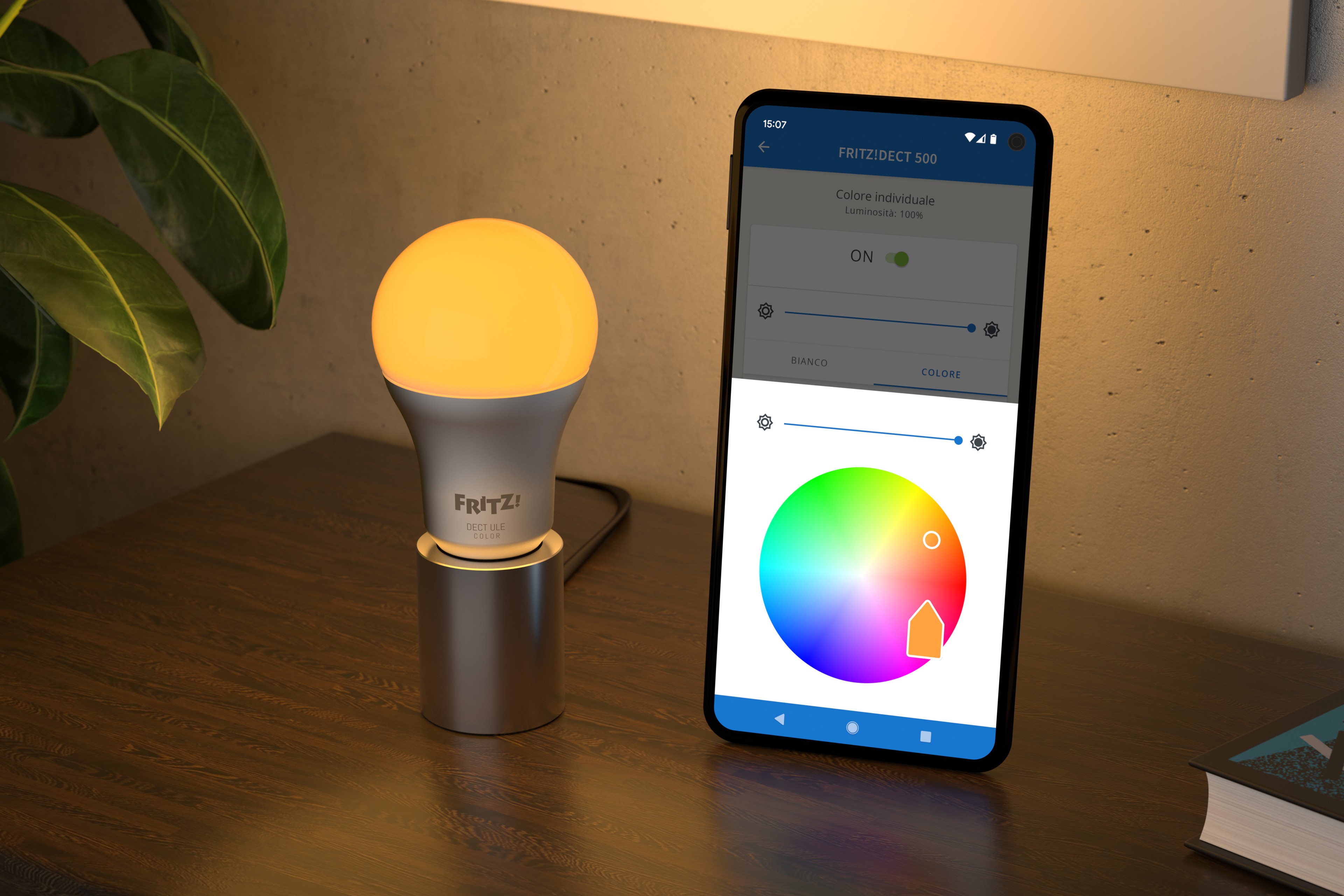 Sia fatto il colore Il FRITZ!DECT 500 porta i colori dell'arcobaleno in casa. La lampada a LED intelligente con luce colorata e bianca supporta lo standard DECT ULE per Smart Home e può essere integrata nella rete locale FRITZ! semplicemente premendo un pulsante. Unito al FRITZ!DECT 500, un FRITZ!Box diventa la centrale di un sistema di illuminazione intelligente. Il FRITZ!DECT 500 è idoneo per i comuni attacchi E27. Il FRITZ!OS 7.20, disponibile ad esempio per i FRITZ!Box 7590, 7530, o 7490, permette di utilizzare immediatamente le funzioni della lampada smart. Luce perfetta per ogni circostanza Con il suo ampio spettro di colori e la straordinaria luminosità, la nuova lampada a LED offre la luce adatta a ogni circostanza. È sufficiente scegliere il colore che i desidera dall'ampia gamma di colori oppure optare per la sobria luce bianca in diversi gradi di calore. Grazie al controllo intelligente dell'illuminazione, è possibile attenuare la luminosità in continuo, adattandola così a ogni esigenza. La comodità del controllo della luce Il FRITZ!DECT 500 può essere controllato in diversi modi: con un FRITZ!Fon o tramite il FRITZ!OS (a partire dalla versione 7.20). La gestione tramite la nuova FRITZ!App Smart Home risulta particolarmente comoda. Da casa o da remoto, con questa nuova FRITZ!App la FRITZ! Smart Home è sempre con voi. Installazione semplice Il FRITZ!DECT 500 si integra nella rete locale in pochi minuti: premendo il tasto DECT o Connect/WPS del FRITZ!Box (a seconda del modello) il FRITZ!DECT 500 viene collegato automaticamente. La lampada a LED viene integrata in tutta sicurezza nella rete locale mediante lo standard DECT ULE. Aggiornamenti automatici Come per tutti gli attuali prodotti FRITZ!, AVM rende disponibili gratuitamente aggiornamenti automatici anche per il FRITZ!DECT 500. Così i dispositivi possono disporre di nuove funzioni e degli aggiornamenti di sicurezza più recenti.