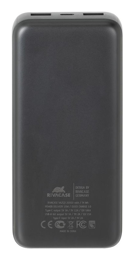 Rivacase VA2521. Capacità della batteria: 20000 mAh, Tecnologia batteria: Polimeri di litio (LiPo). Porte di uscita USB di tipo A: 2, Quantità di porte USB Tipo C: 1. Colore del prodotto: Grigio