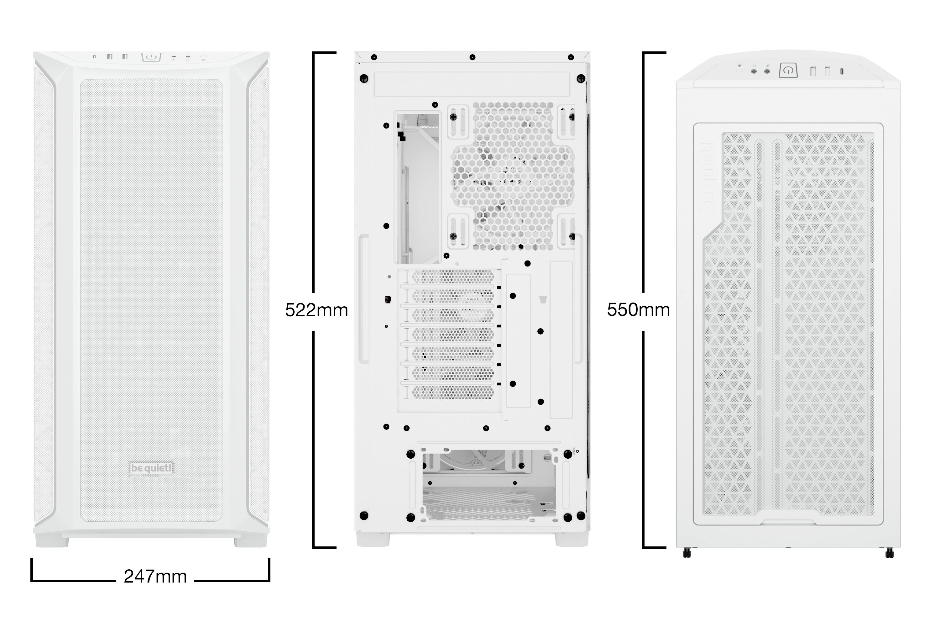 be quiet! Shadow Base 800 FX White. Fattore di forma: Midi Tower, Tipo: PC, Colore del prodotto: Bianco. Fattori di forma di alimentazione supportati: ATX, PS2. Ventole anteriori installate: 3x 140 mm, Diametro delle ventole frontali supportato: 120,140 mm, Rear fans installed: 1x 140 mm. Dimensioni di hard disk drive supportati: 2.5,3.5". Larghezza: 247 mm, Profondità: 550 mm, Altezza: 522 mm
