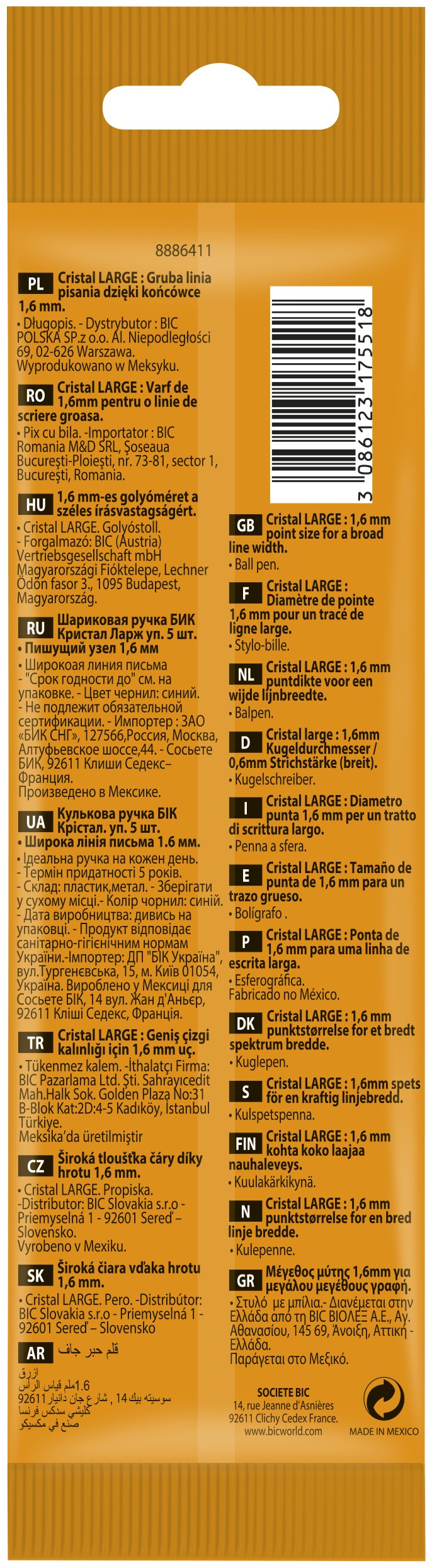 BIC Cristal Large, Penne blu a sfera (punta 1.6mm), confezione da 5 pezzi. Colore del prodotto: Blu, Trasparente, Colore penna: Blu, Tipo: Penna a sfera. Quantità per pacco: 5 pz, Larghezza imballo: 63 mm, Profondità imballo: 11 mm