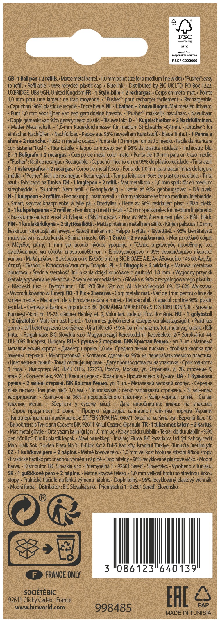 Recensioni Bic Cristal Re´new Confezione di Penna a Sfera Ricaricabile + 2 Ricariche - Punta Tonda da 1,0 mm - Corsa 0,32 mm - Inchiostro a Base di Olio - Corpo Metallico - Colore Blu