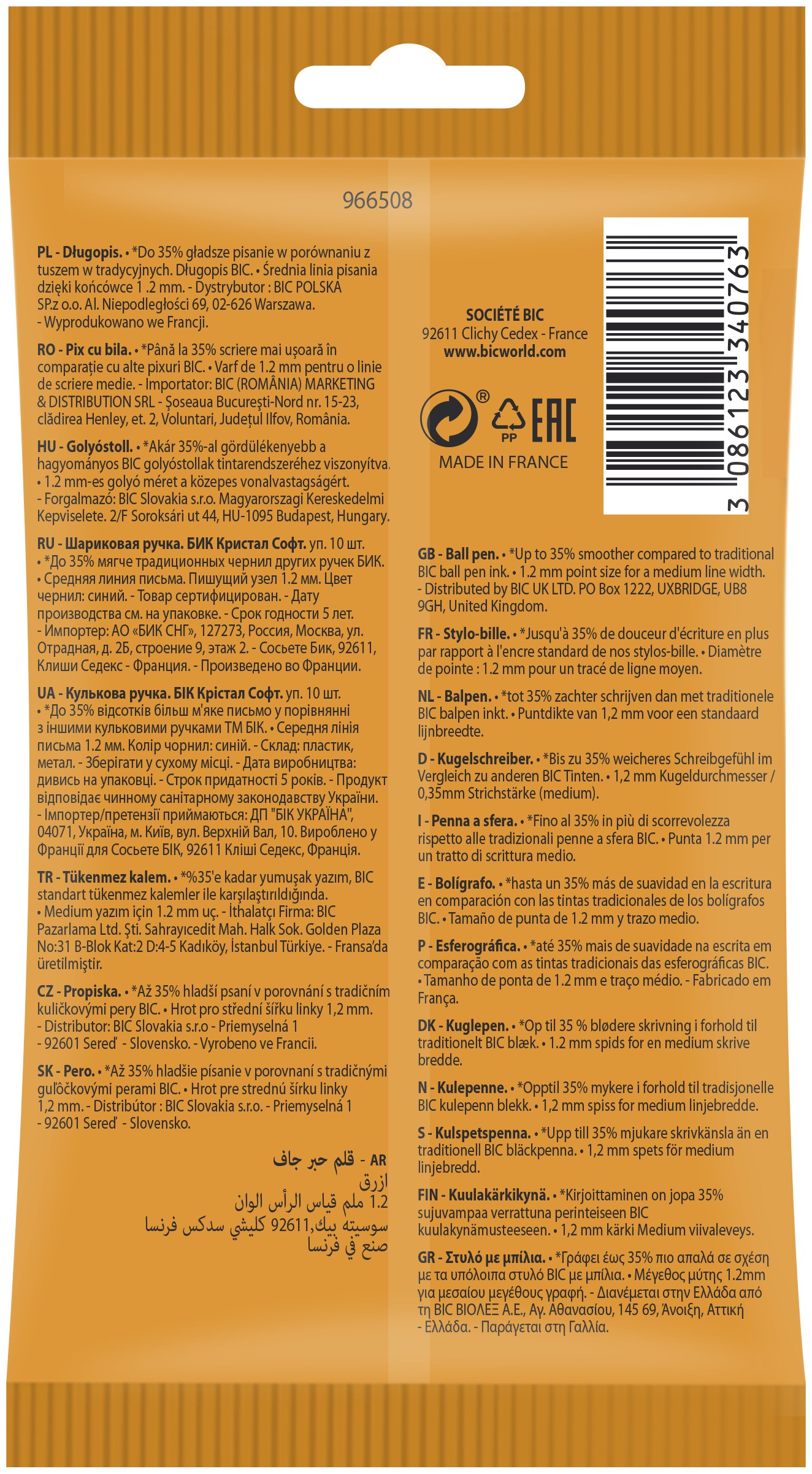 BIC Cristal Soft, Penne Blu a Sfera (Punta Media 1.2mm), Confezione da 10. Colore del prodotto: Blu, Trasparente, Colore penna: Blu, Tipo: Penna a sfera. Quantità per pacco: 10 pz