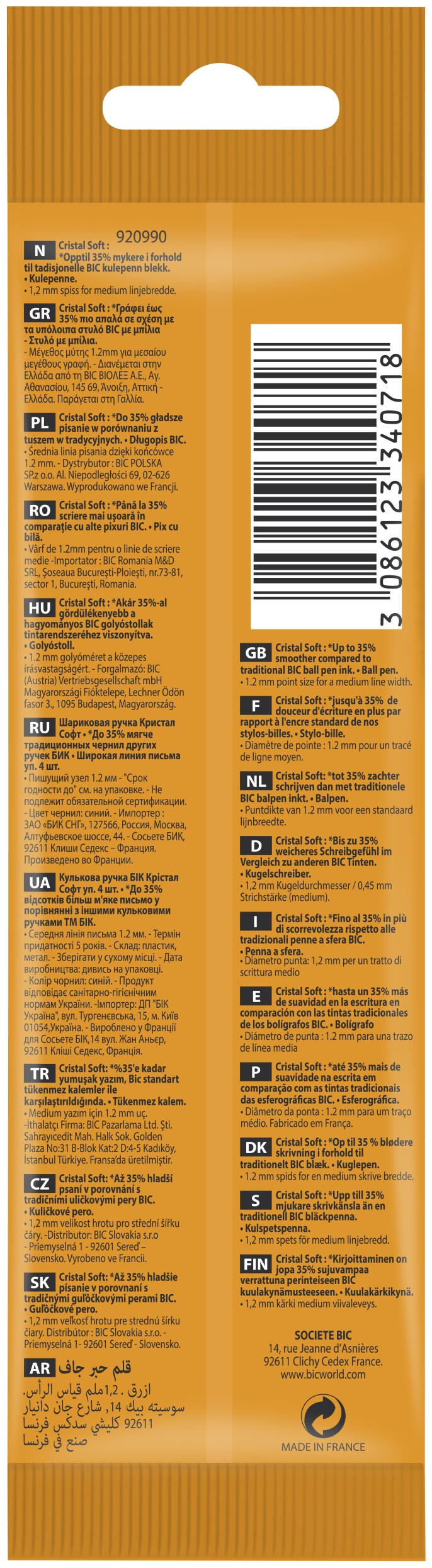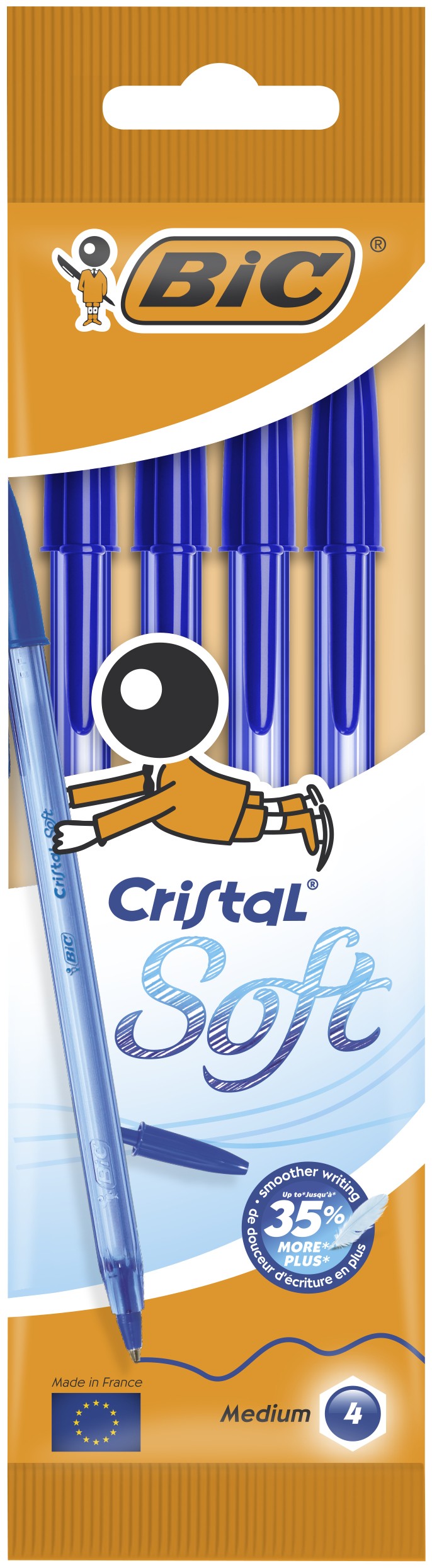 BIC Cristal Soft, Penne Blu a Sfera (Punta Media 1.2mm), Confezione da 4. Colore del prodotto: Blu, Colore penna: Blu, Tipo: Penna a sfera. Quantità per pacco: 4 pz
