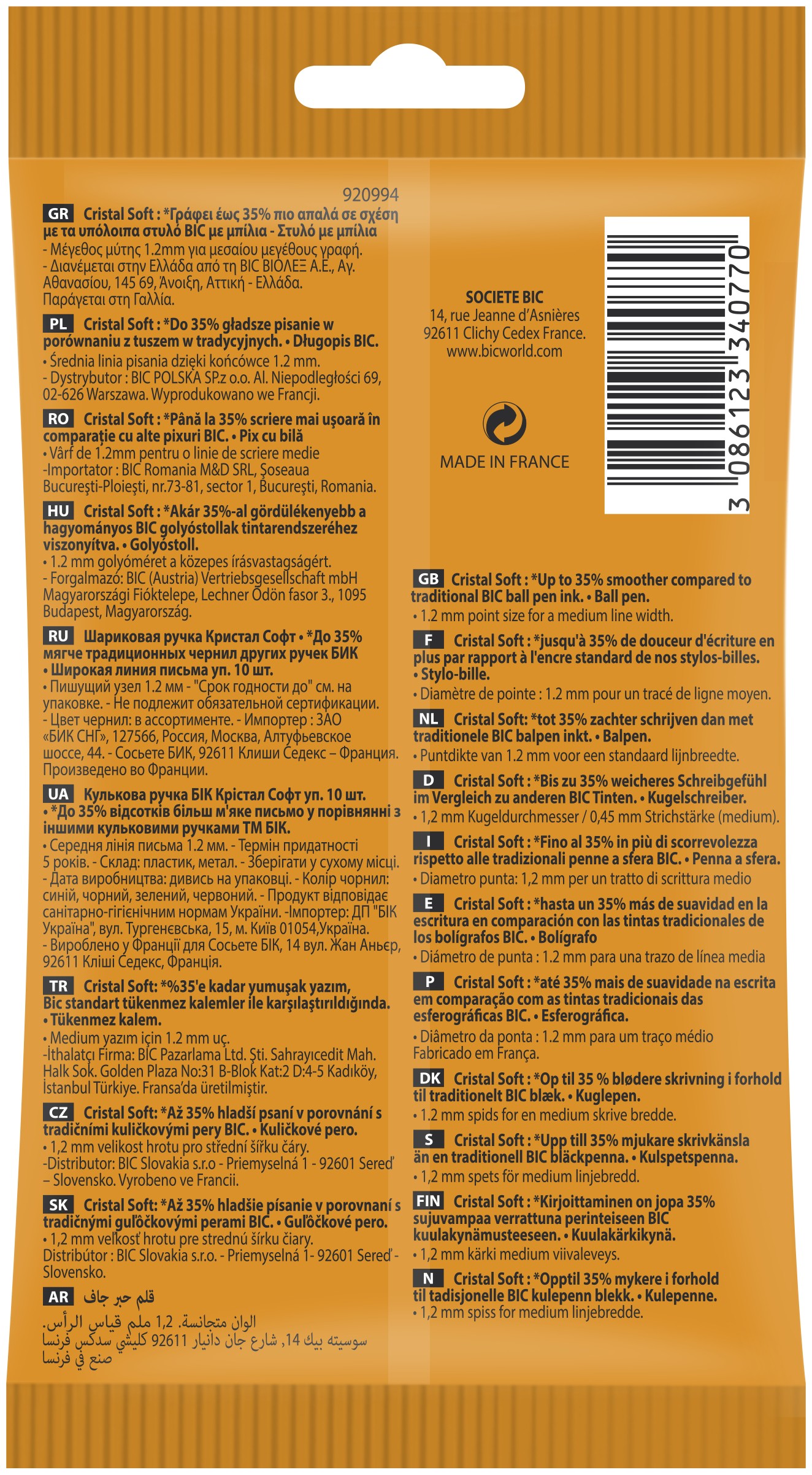 BIC Cristal Soft, Penne a Sfera in Colori Assortiti (Punta 1.2mm), Confezione da 10. Colore del prodotto: Nero, Blu, Verde, Rosso, Trasparente, Colore penna: Nero, Blu, Verde, Rosso, Tipo: Penna a sfera. Quantità per pacco: 10 pz