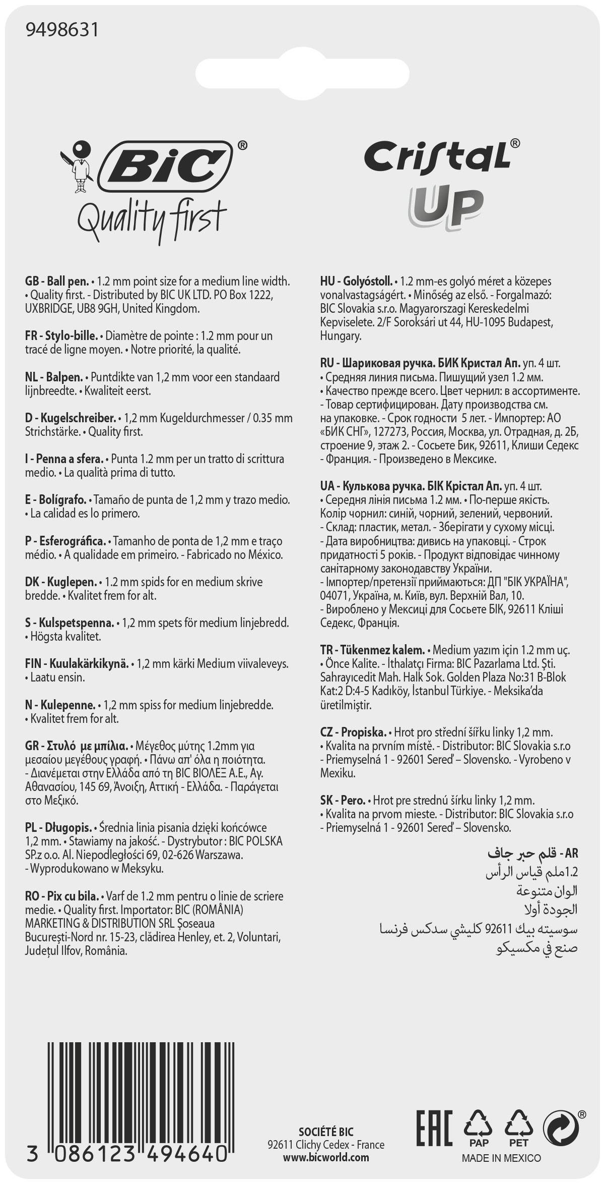 BIC Cristal Up, Penne a Sfera in Colori Assortiti (Punta 1.2mm), Confezione da 4. Colore del prodotto: Multicolore, Bianco, Colore penna: Multicolore, Tipo: Penna a sfera retrattile a clip. Quantità per pacco: 4 pz, Tipo di imballo: Blister