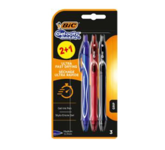 Bic Gel-Ocity Quick Dry 2+1 Confezione da 3 Penne a Sfera Retrattili - Impugnatura in Gomma - Punta Media 0,7 mm - Asciugatura Ultra rapida - Non macchia la carta - Colori Assortiti
