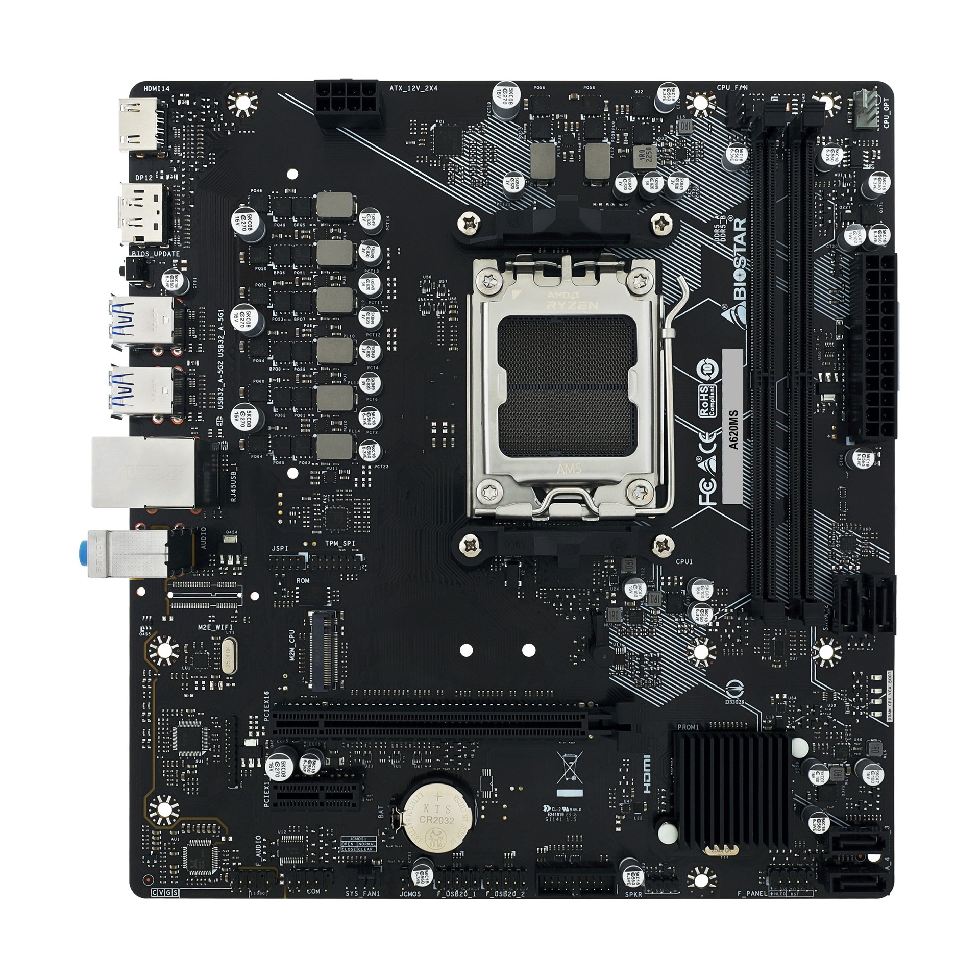 Biostar A620MS, AMD, Socket AM5, AMD Ryzen 7000 Series, AMD Ryzen 8000 Series, AMD Ryzen 9000 Series, DDR5-SDRAM, 128 GB, DIMM
