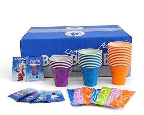 Kit da 100 pezzi composto da bicchieri, palette e zucchero per gustare nel migliore dei modi le capsule Borbone