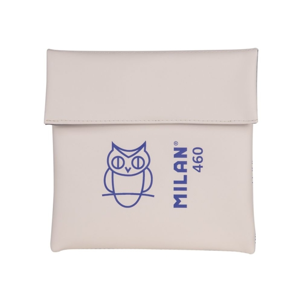Piccola borsa termica per alimenti a forma di busta. Beige con stampa gufo blu navy. Collezione 460 since 1918, ispirata ai colori e al design originali delle gomme MILAN, prodotte in Spagna dal 1918.